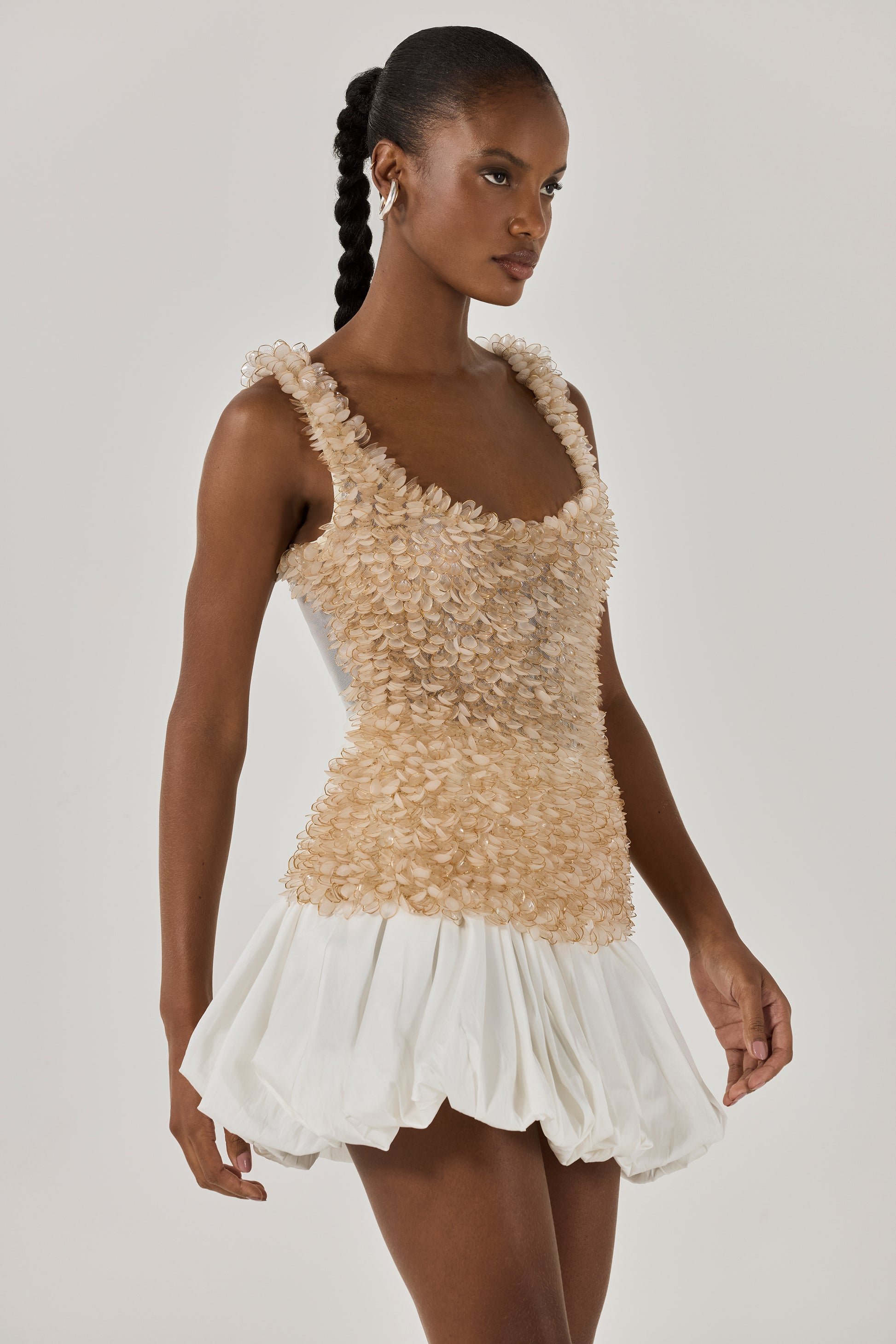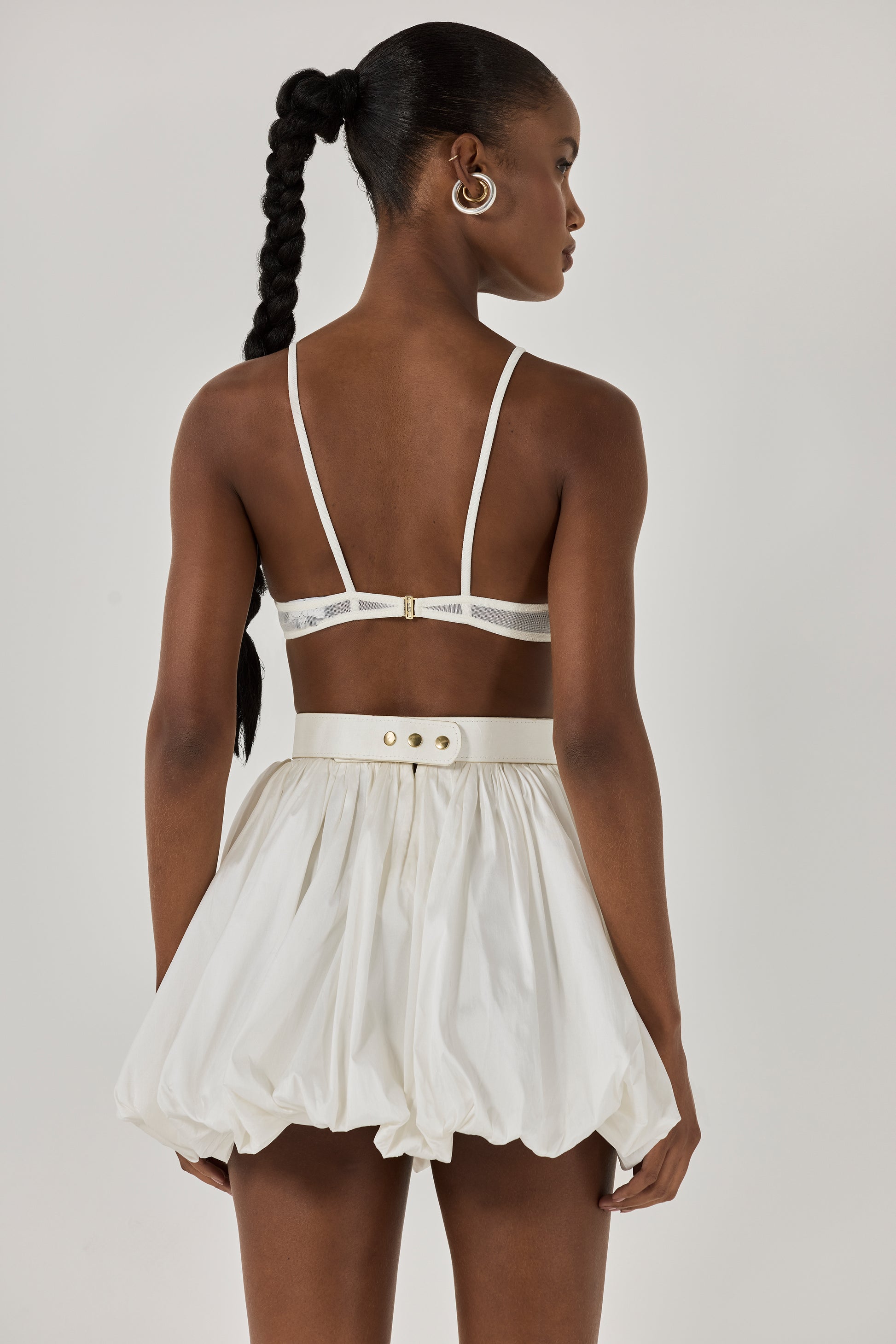 Saia mini de cintura alta confeccionada em tafetá, possui fechamento com zíper e botões bombê. acompanha cinto com fivela de borboleta dourada.