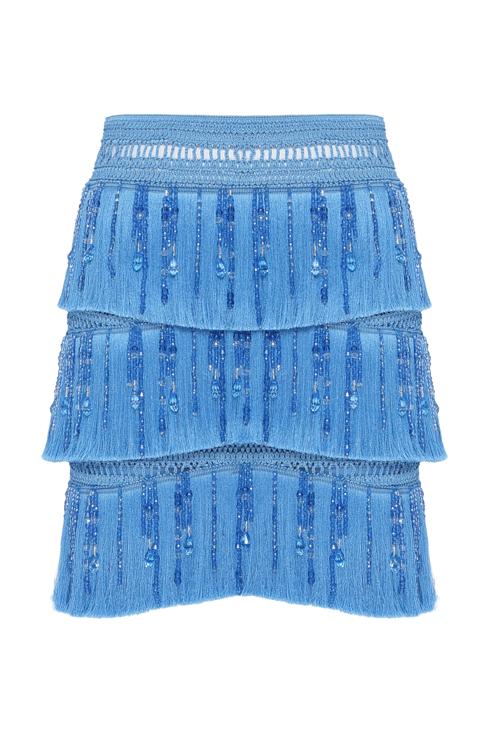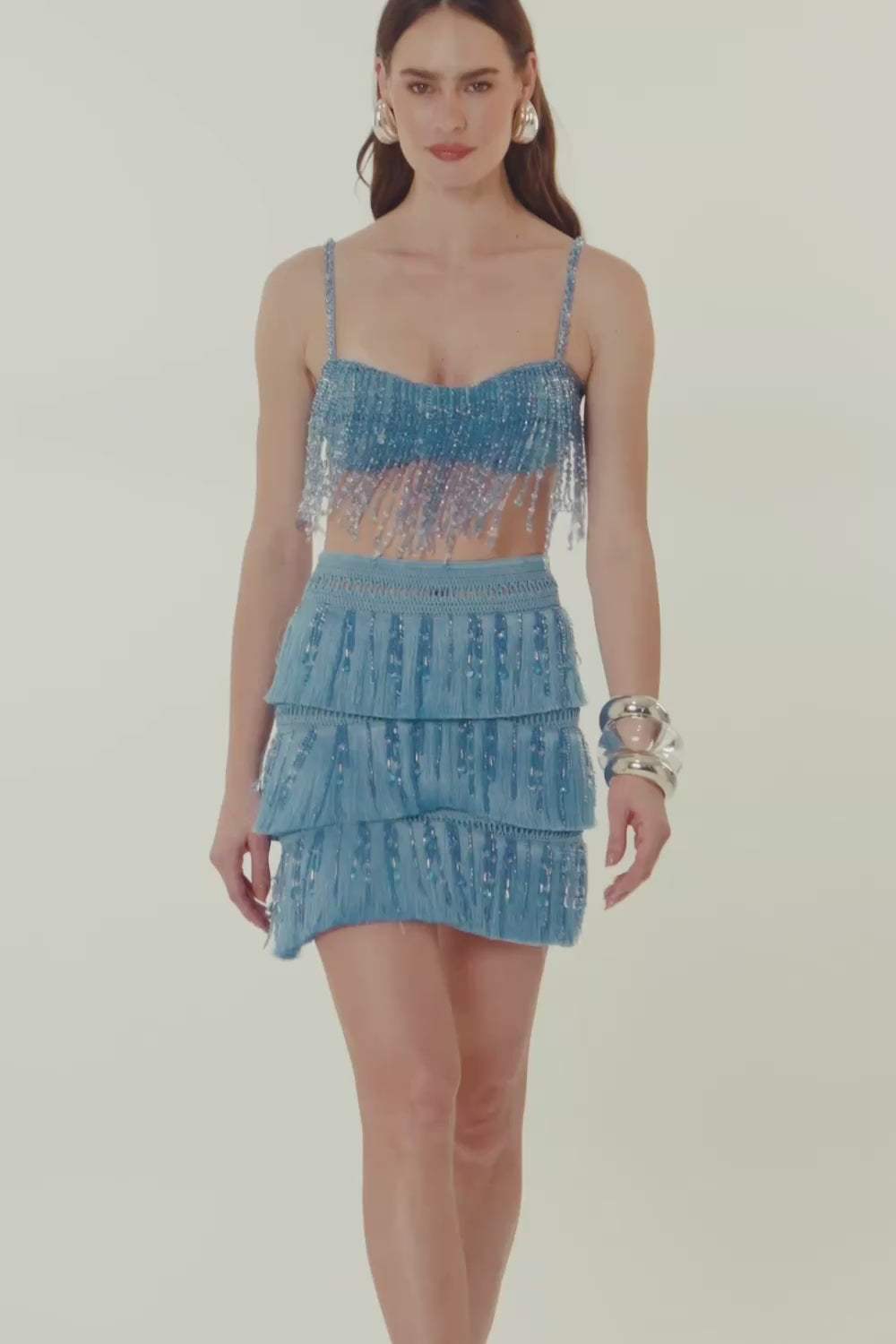Saia curta feita com aplicações de tecido tramado, formando uma textura artesanal que remete ao crochet, com franjas de tecido e franjas de pedrarias bordadas manualmente, criando um jogo de luz e profundidade, com acabamento delicado e impactante.