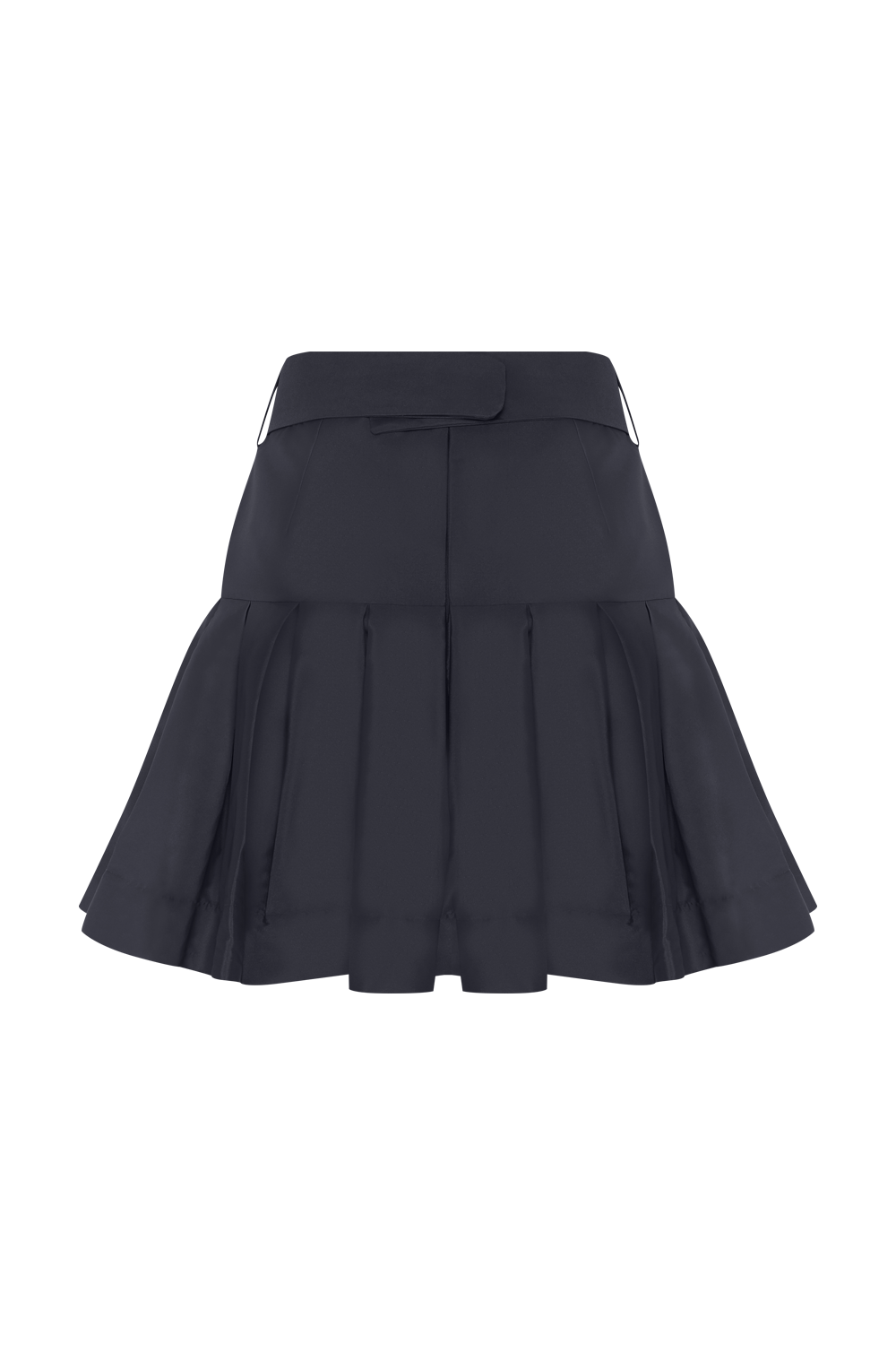 A saia curta em tafetá preto é confeccionada em tecido estruturado, com pregas marcantes que criam volume e movimento delicado. A cintura alta ganha destaque com um broche de cristal, conferindo um toque glamouroso ao corte clássico. Uma peça moderna, com apelo atemporal e presença sofisticada.