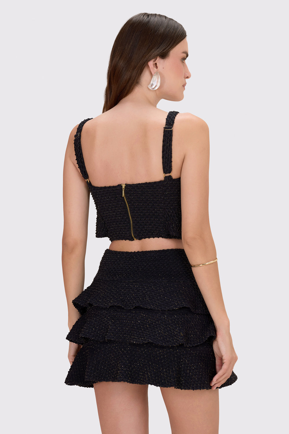 Com um toque jovem e romântico, a saia curta em malha jacquard com lurex combina brilho sutil e movimento fluido em uma silhueta cheia de charme. A pala com aviamento dourado na frente adiciona um detalhe sofisticado ao visual. Os babados em camadas criam um efeito leve e dançante a cada passo, enquanto o zíper lateral garante vestibilidade impecável. Forrada para maior conforto, é a peça perfeita para compor looks festivos e modernos — seja com top coordenado ou mixando texturas para um styling com personalidade.