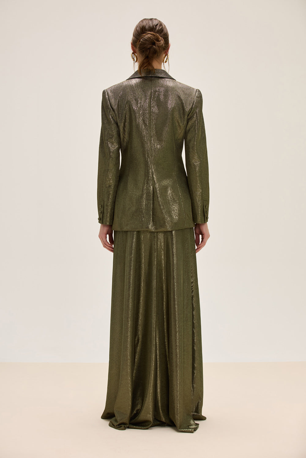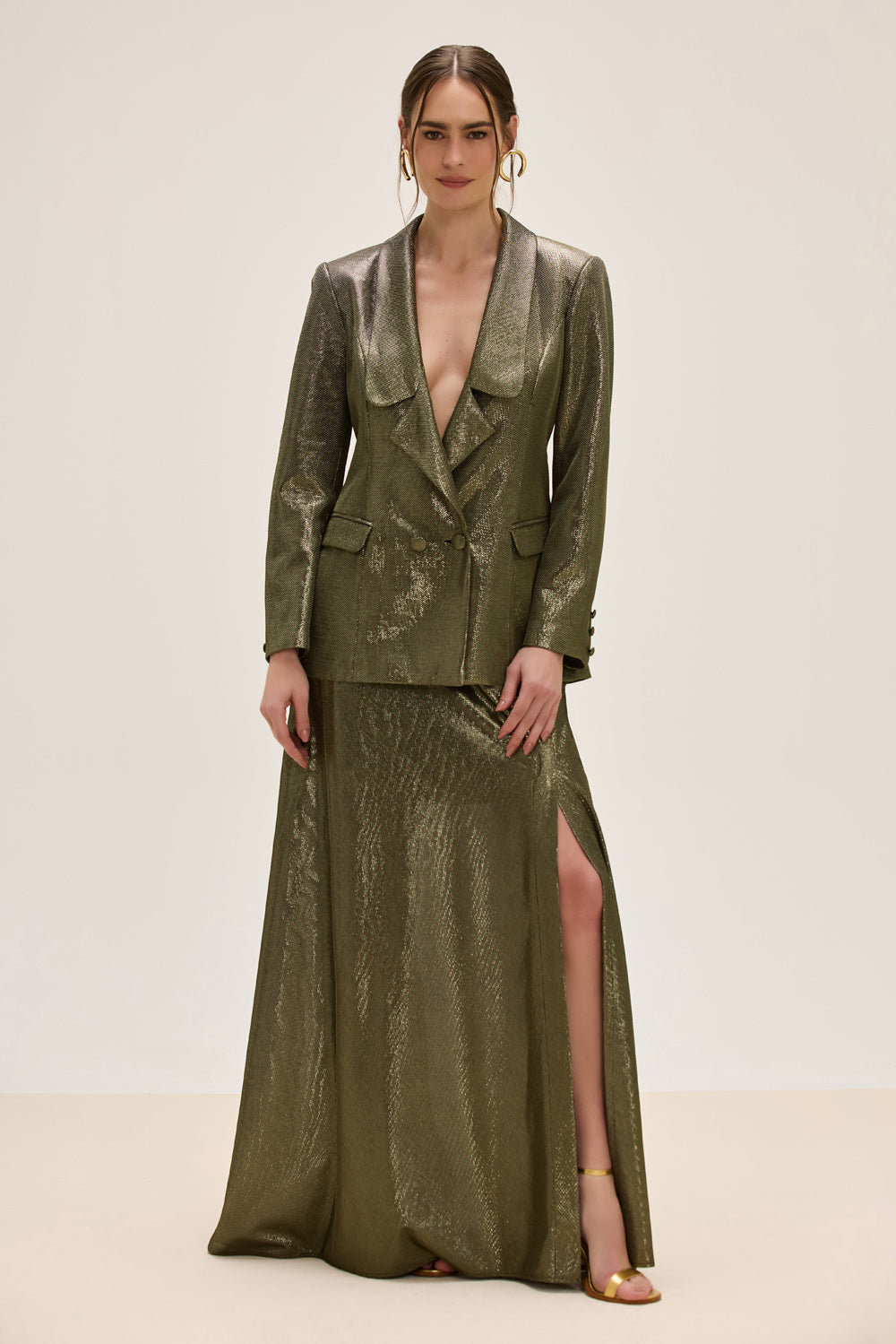 Confeccionada em tecido lurex, esta saia longa combina o brilho sutil do material com uma silhueta fluida e contemporânea. A fenda lateral acrescenta movimento e sensualidade na medida certa, enquanto o zíper invisível garante um acabamento limpo e sofisticado.
