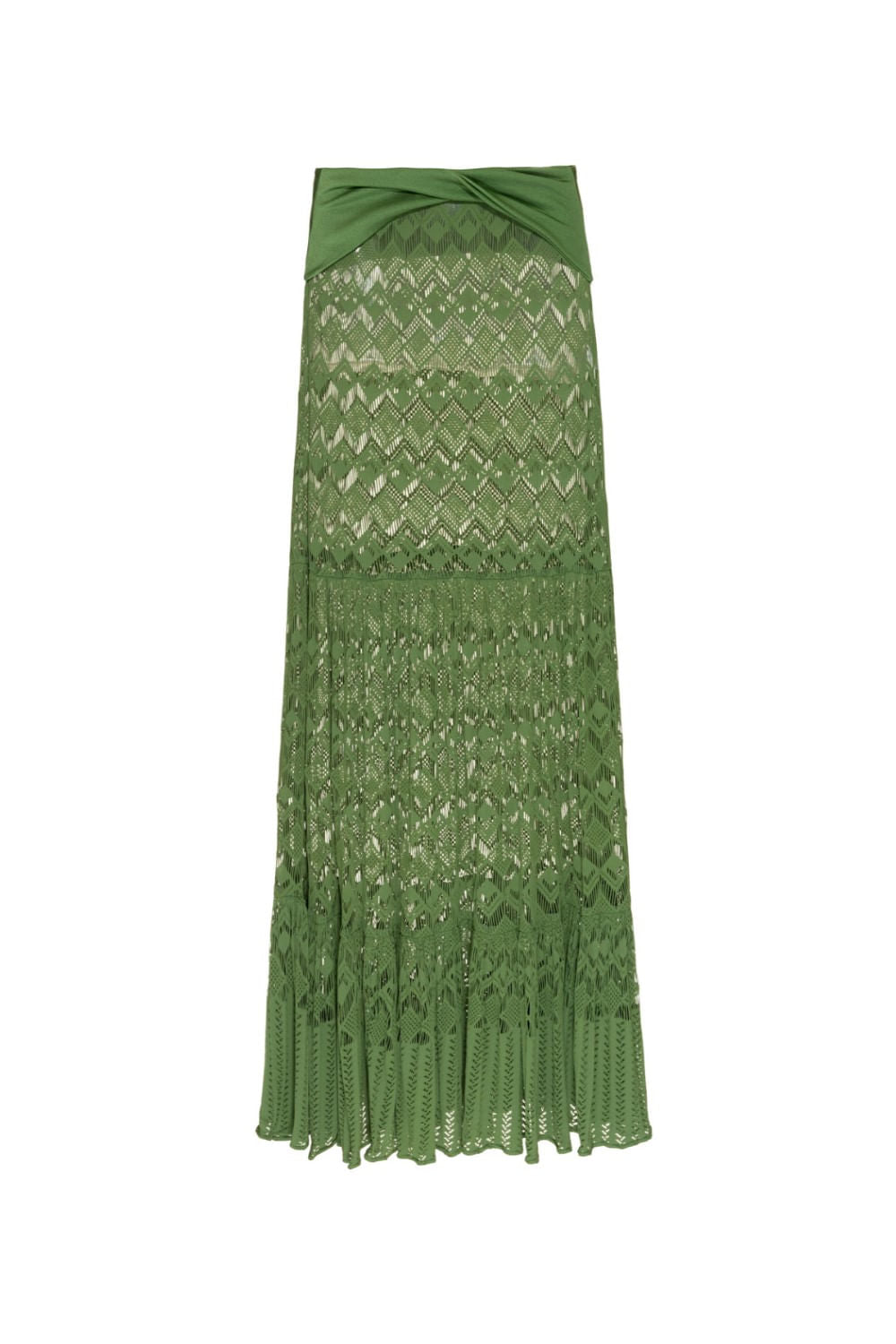 Saia longa em tela com cós duplo em Lycra, torção no centro frente e dois recortes no comprimento.