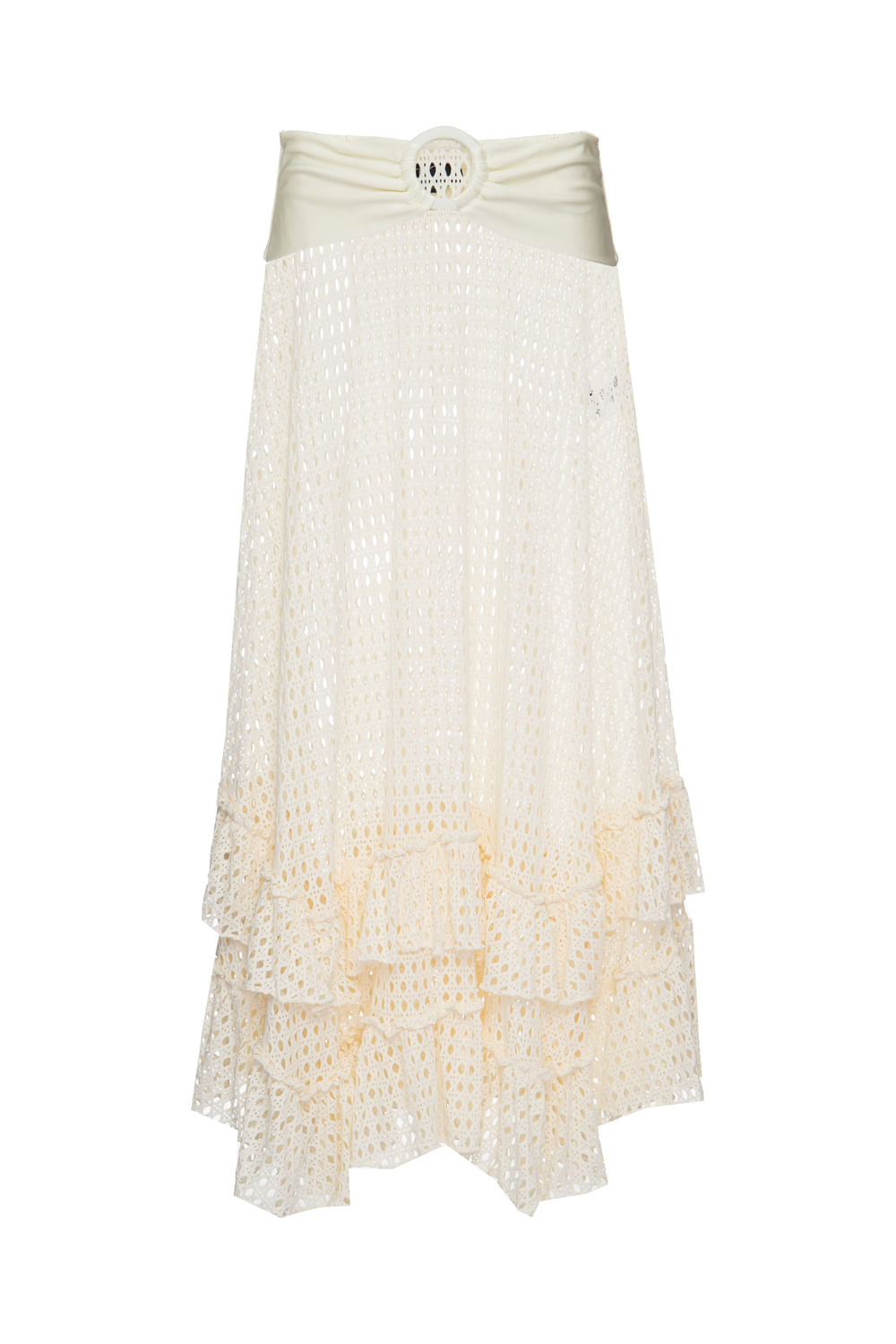 Saia longa em tela com cós duplo de Lycra, fivela redonda forrada no centro frente, dois recortes com babado e barra assimétrica.