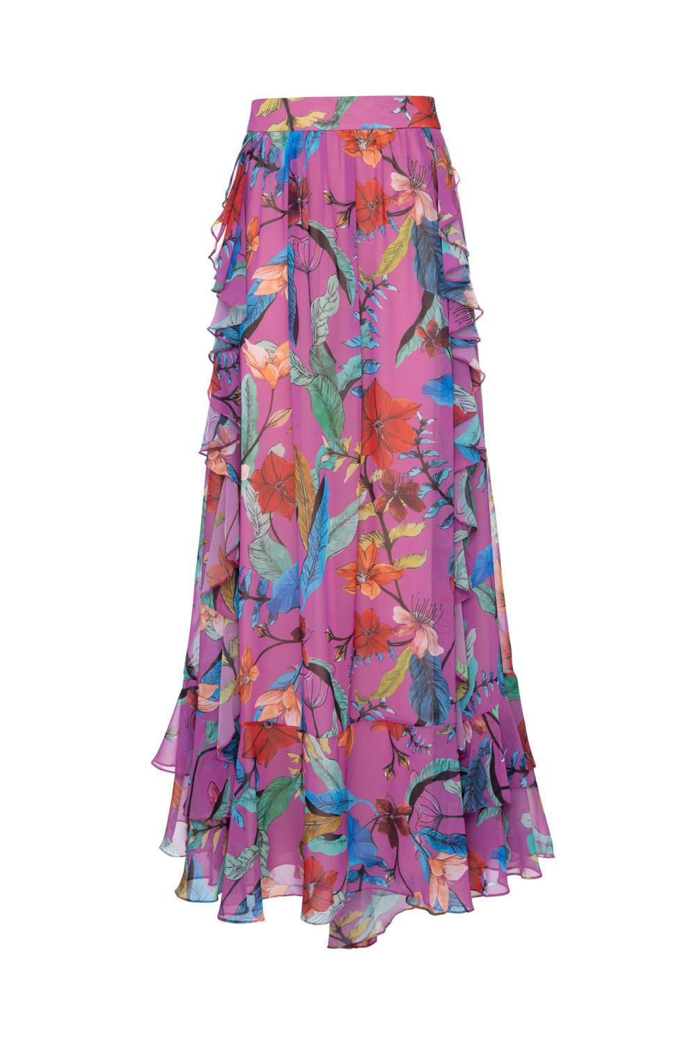 Saia longa estampada com cós duplo, duas tiras de babado no comprimento, zíper invisível na parte posterior do quadril e forro interno.