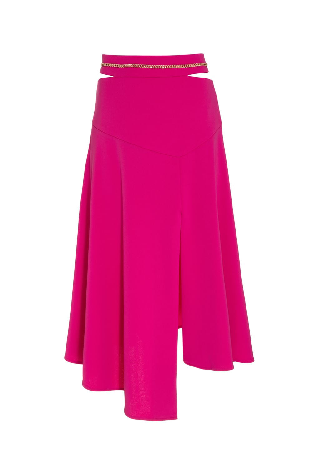Saia mídi detalhe com corrente no cós, duas aberturas laterais, recorte assimétrico abaixo do quadril, zíper invisível no centro costas e forro interno.