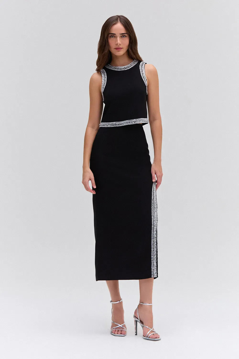 Saia midi confeccionada em crepe com forro, possui bordado de pedraria, fenda lateral assimétrica transpassada e fechamento com zÃper invisÃvel nas costas.