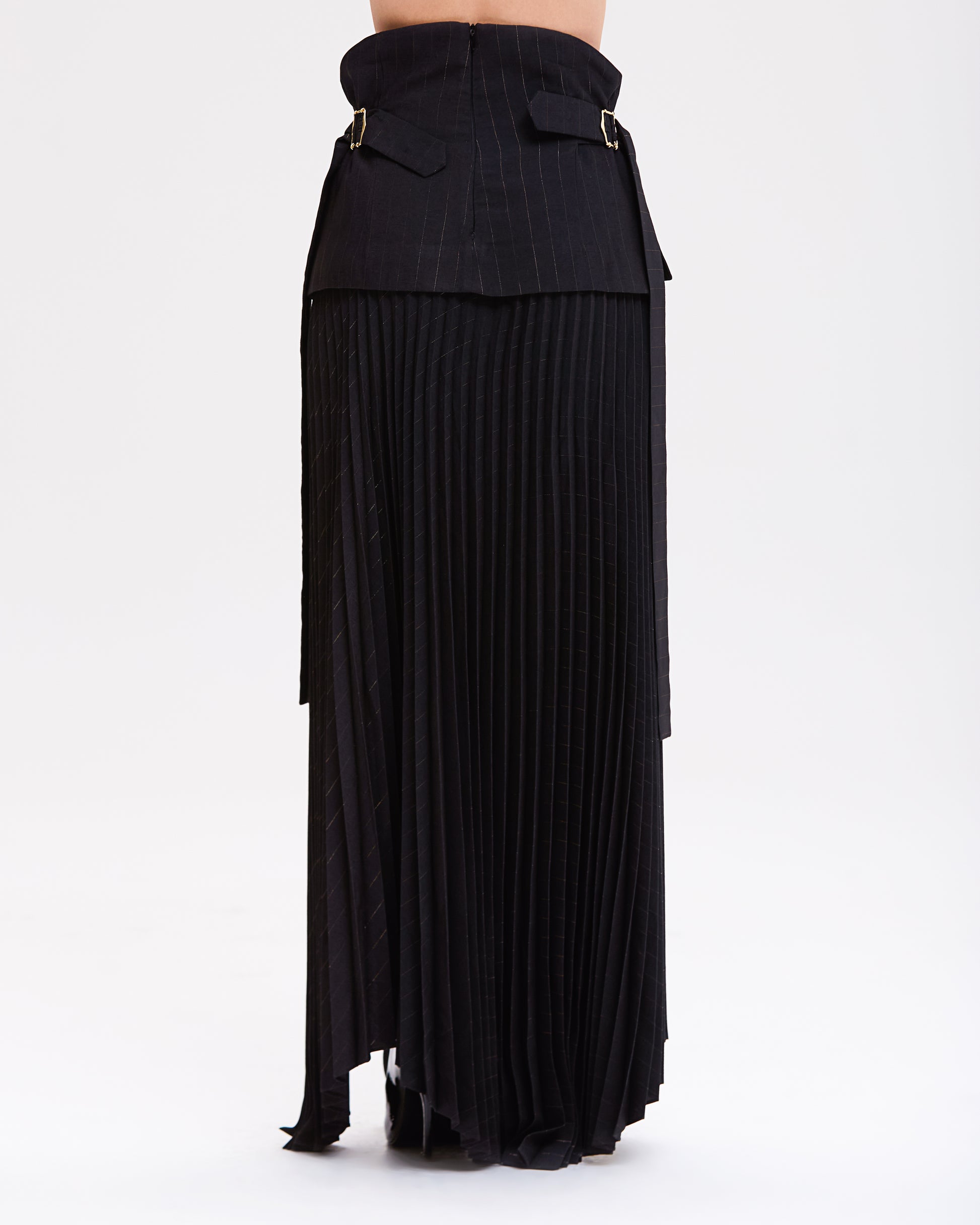 Confeccionada em tecido de alfaiataria com risca de giz, esta saia traz uma leitura moderna de um clássico atemporal. O fechamento com zíper invisível preserva a fluidez do design, enquanto os ajustes com fivelas nas laterais adicionam personalidade e funcionalidade à peça