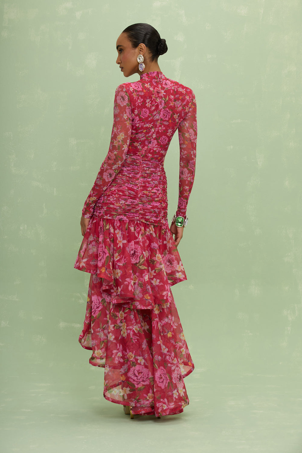 Saia midi de tule, toda franzida que modela e valoriza a silhueta. Babados de chiffon na barra, criando um efeito harmonioso e bem volumoso, comprimento assimétrico, mais curto na frente e longo atrás, conferindo um visual fashion moderno e criativo. Estampada com flores, que equilibra o design com feminilidade e ousadia.