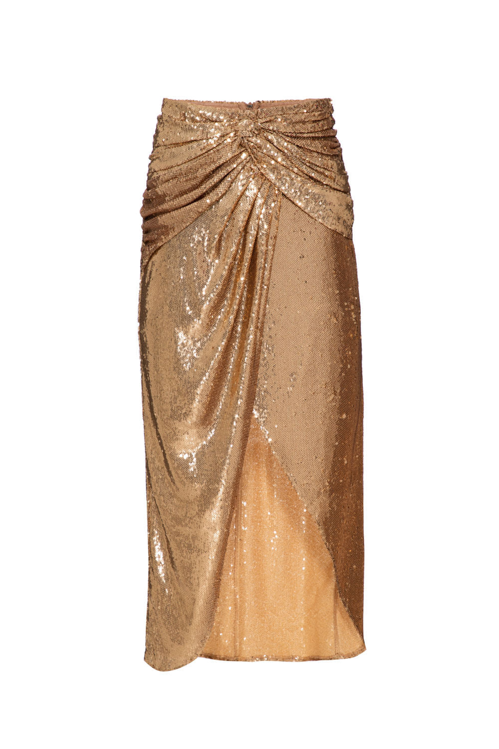 Saia mídi em paetê com aplicação de franjas, pala franzida com nó no cós, elástico embutido na cintura, fenda frontal, zíper invisível no centro costas e forro interno parcial.