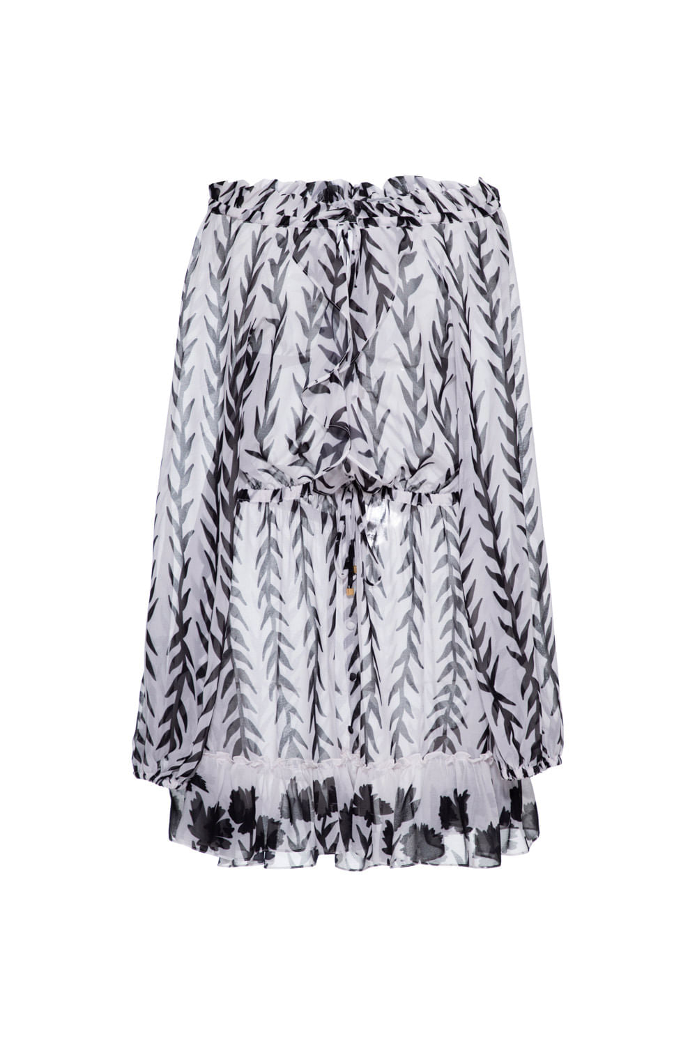 Saída de praia curta estampada com babados. mangas compridas, elástico embutido nos punhos, amarração no centro frente e sete botões para fechamento no decote.