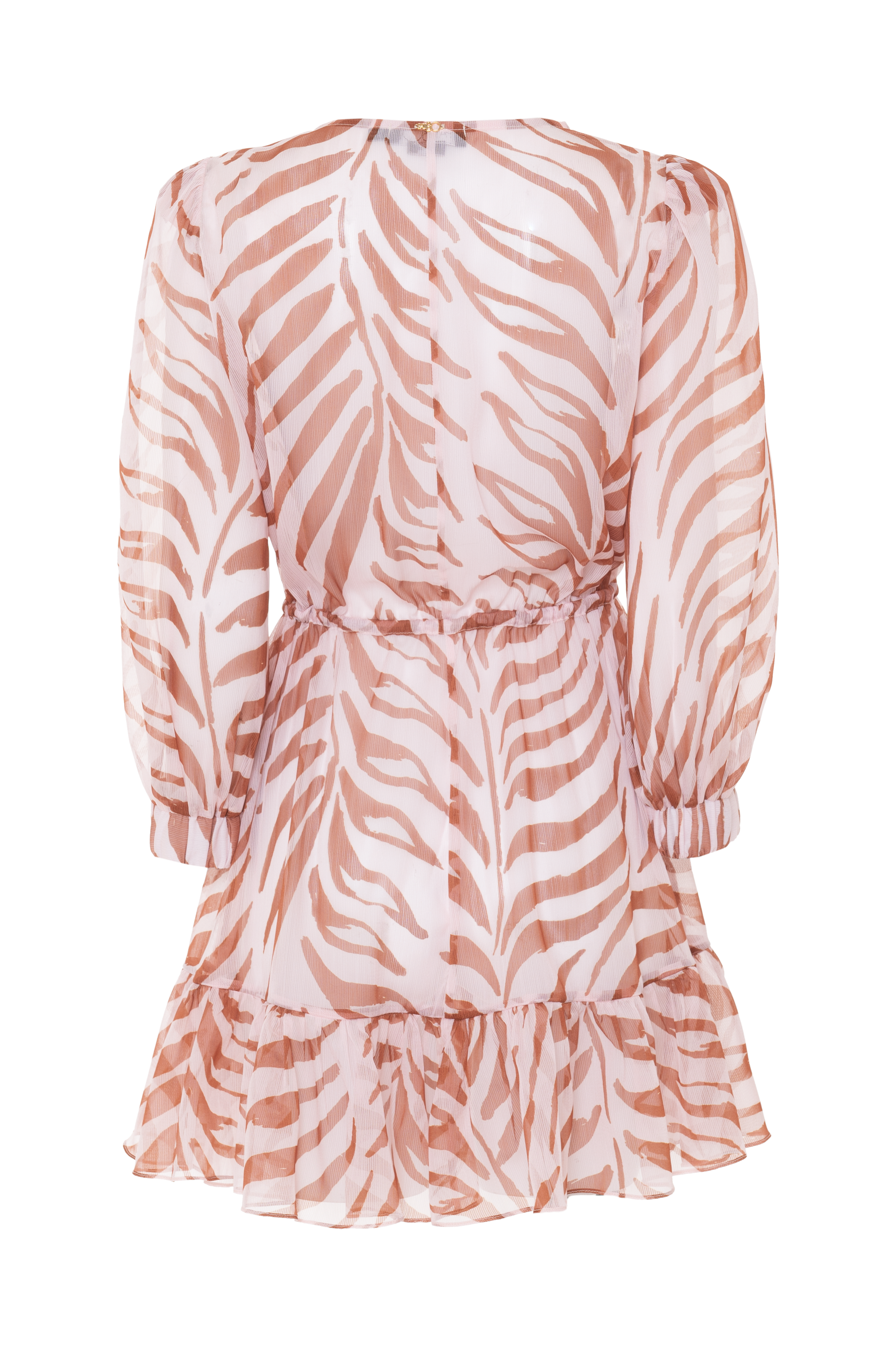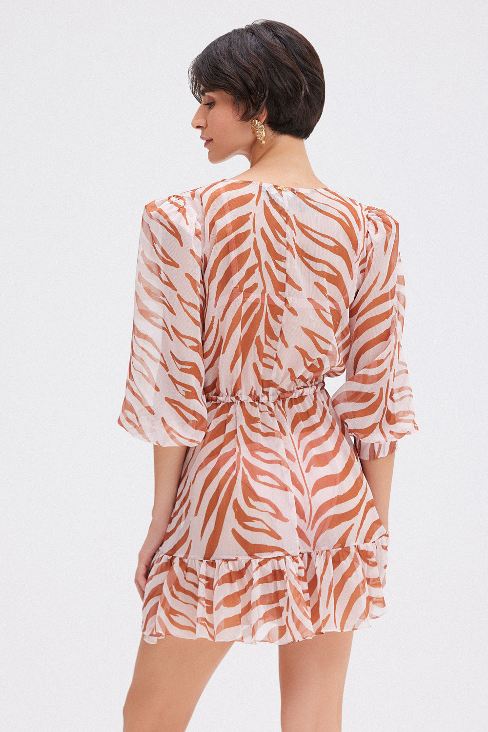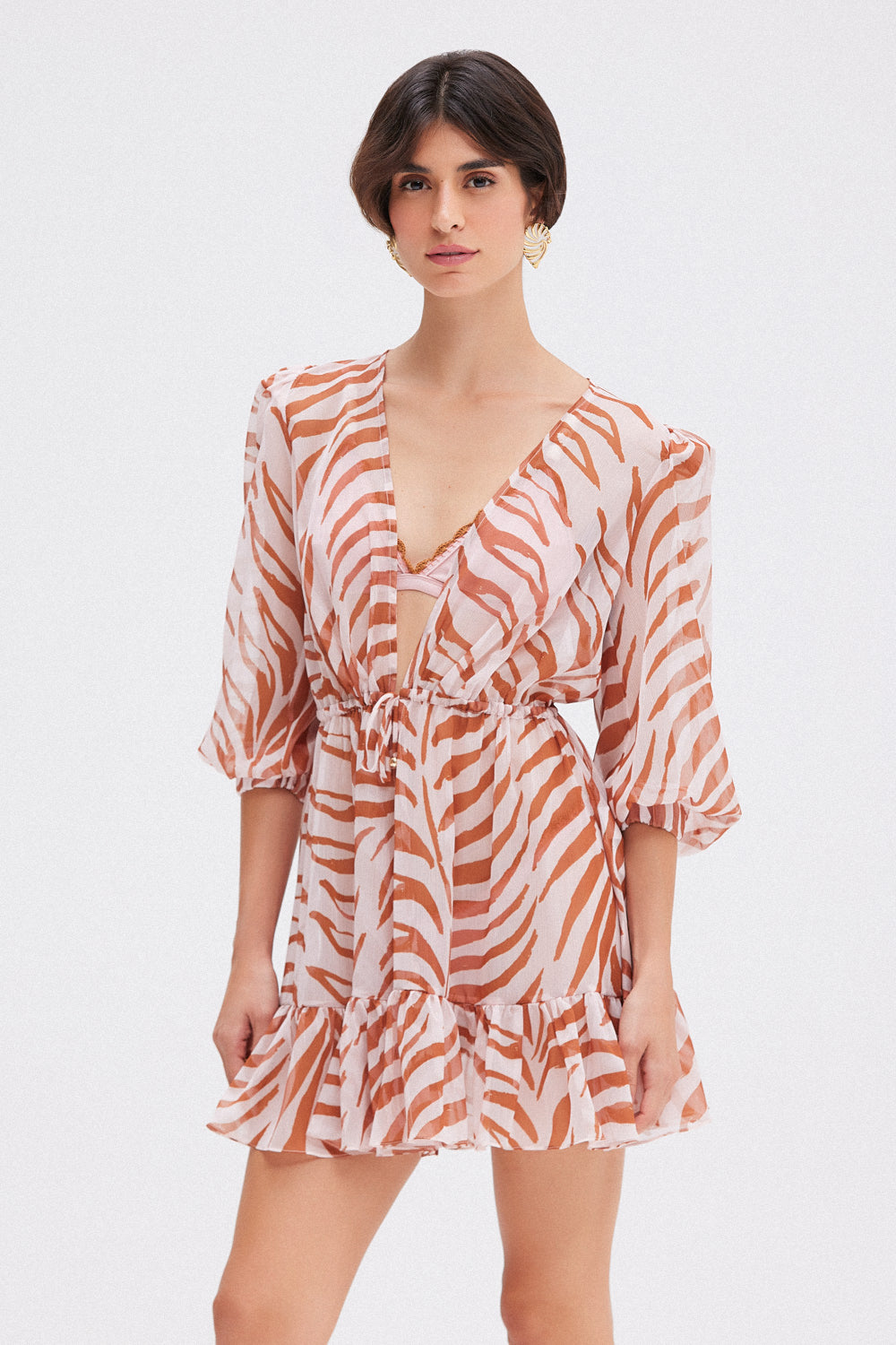 Com leveza e bossa de sobra, esta saída de praia curta é feita em chiffon fluido com estampa exclusiva — composta por elementos pintados à mão que traduzem o espírito artístico da marca. O decote V profundo e a cintura marcada com fita para amarração valorizam a silhueta com feminilidade, enquanto as mangas 3/4 com ombreiras e punhos com elástico trazem um toque de sofisticação descontraída. O babado na barra adiciona movimento delicado à peça. Perfeita para ser usada sobre os biquínis coordenados, criando um visual completo, elegante e cheio de personalidade para dias de sol.