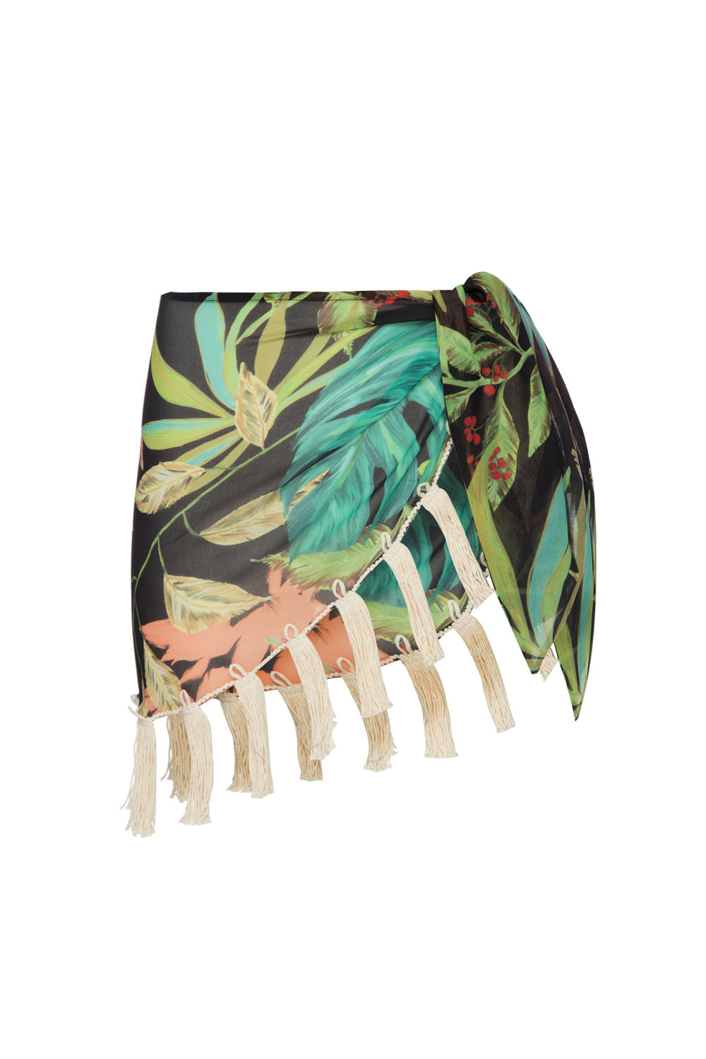 Saída de praia curta estampada com amarração na lateral e franja na barra.