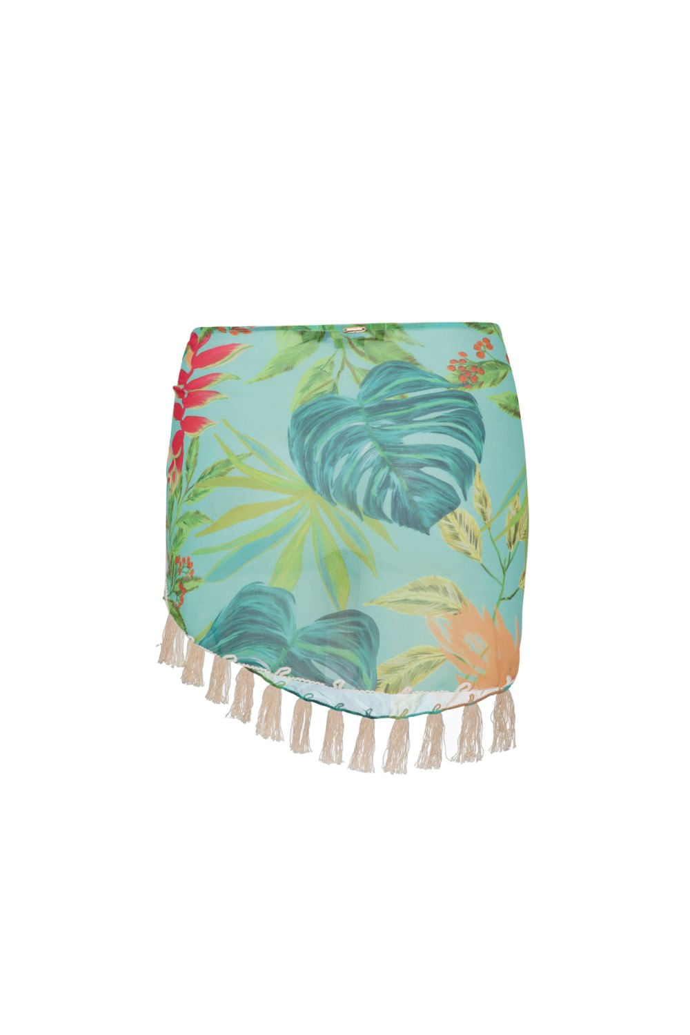 Saída de praia curta estampada com amarração na lateral e franja na barra.