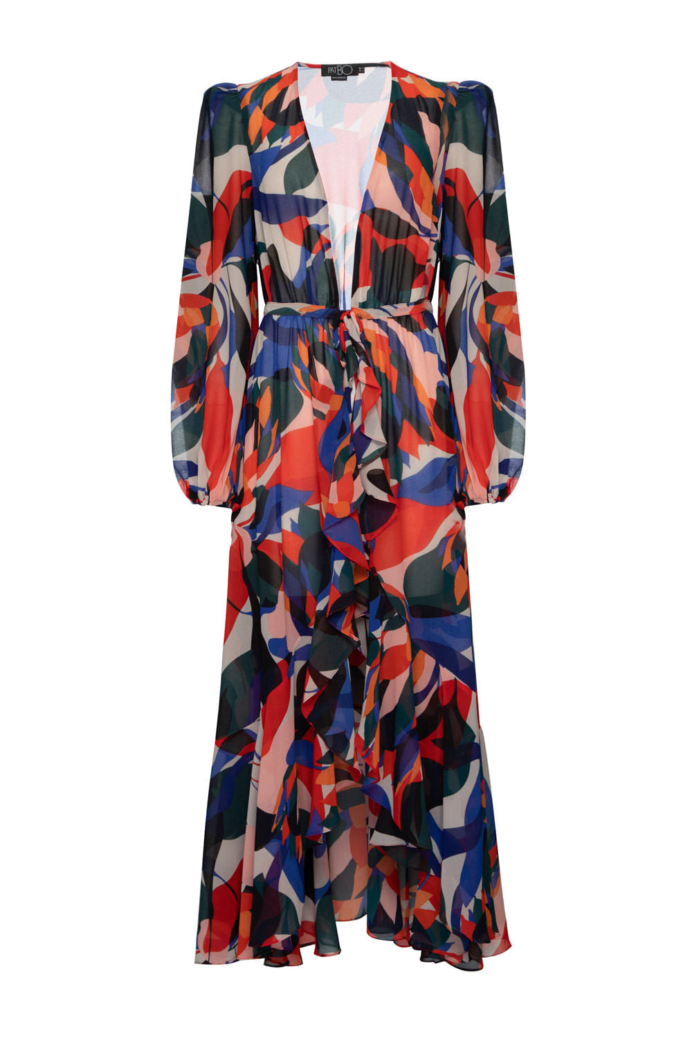 Saída de praia longa com ombreiras, elástico embutido nos punhos, pala com babado na fenda frontal e cordão para amarração na cintura.