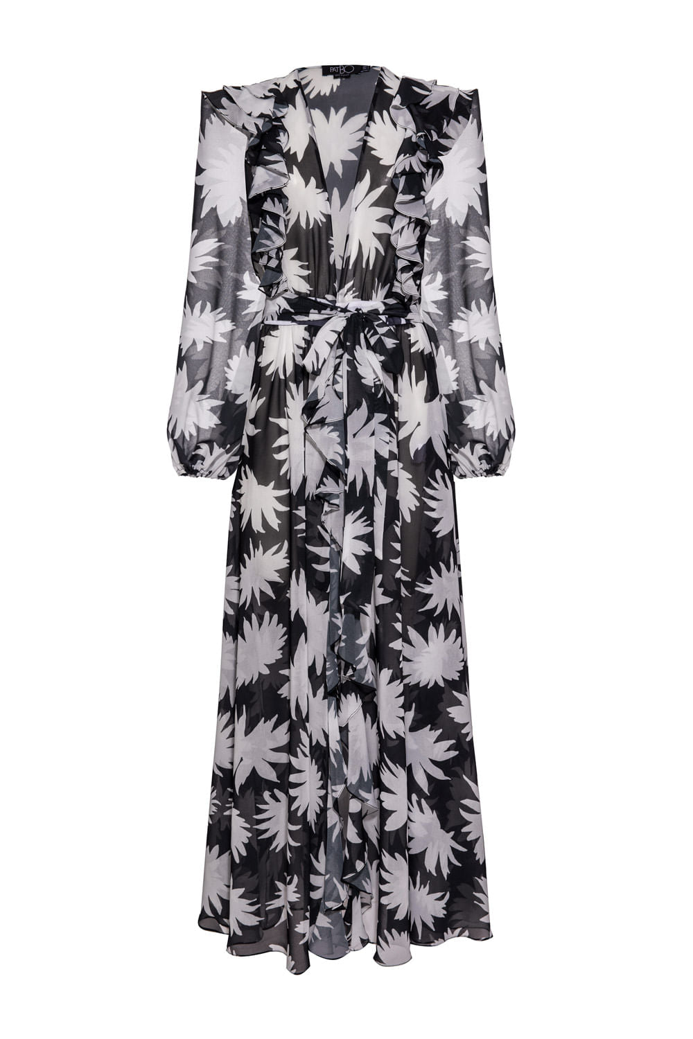Saída de praia longa estampada com babados, mangas compridas, elástico embutidos nos punhos, faixa embutida na cintura, fenda frontal, fechamento da saia com onze botões encapados. Acompanha forro solto.