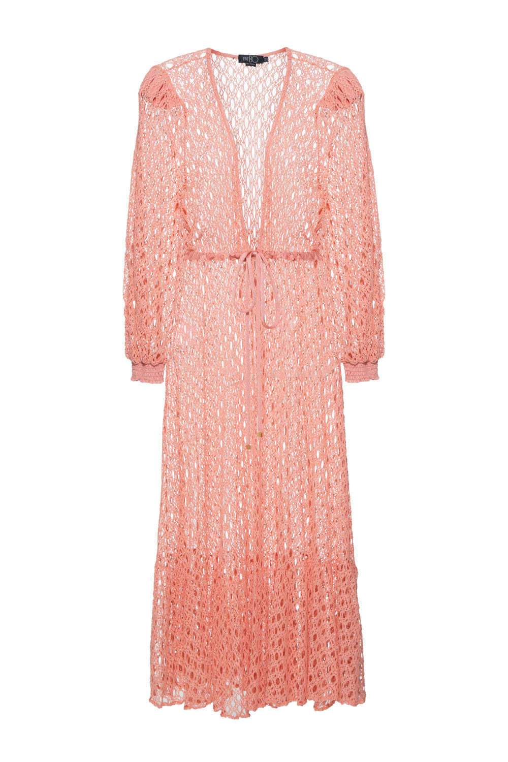 Saída de praia longa em tela com mangas compridas, ombreiras, lastex nos punhos, cordão para amarração no centro frente e recorte horizontal na saia.