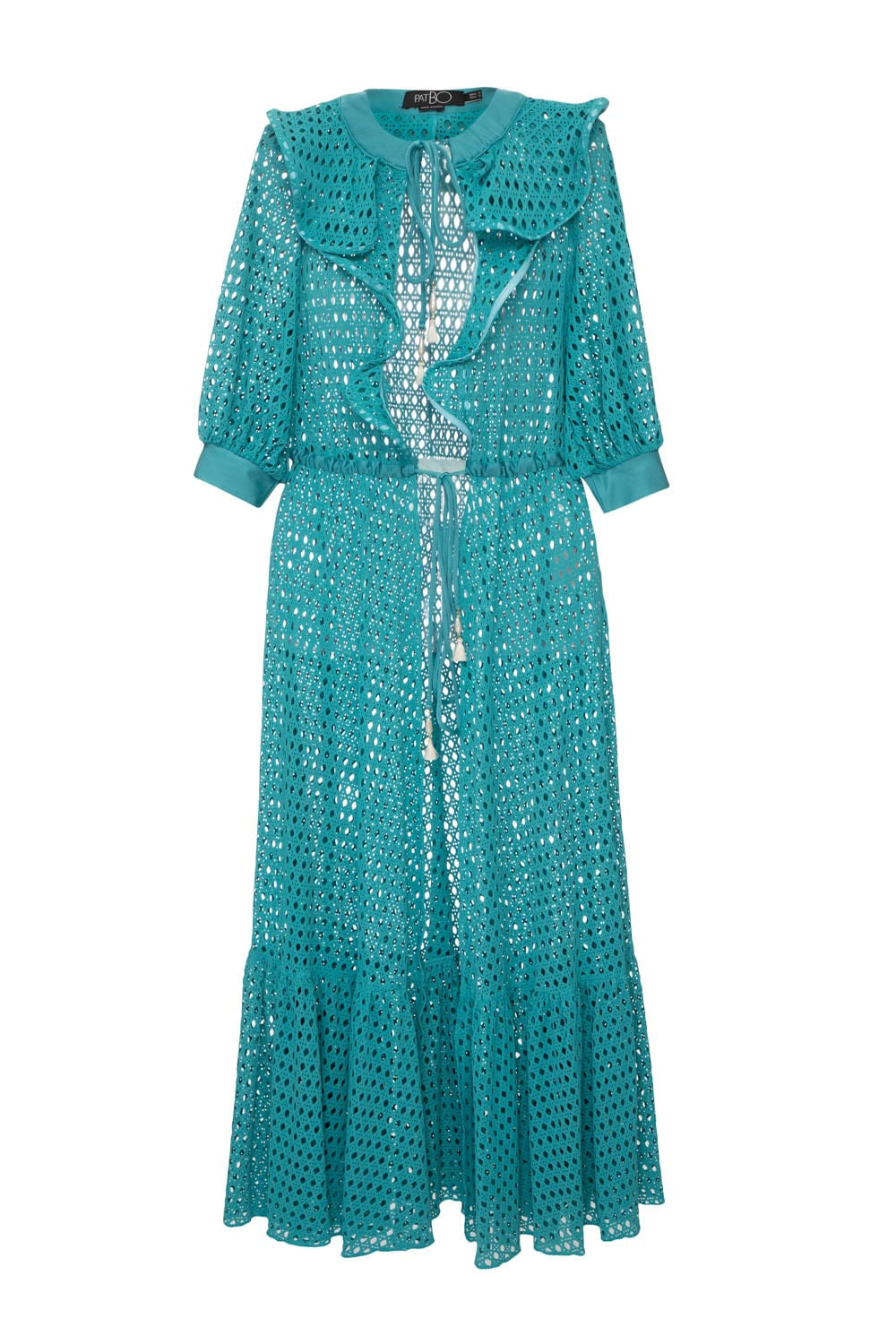 Saída de praia longa em tela, com mangas ¾ levemente bufantes, punhos em Lycra, babado na gola, cordão para amarração na gola e na cintura e recorte com franzido na barra.