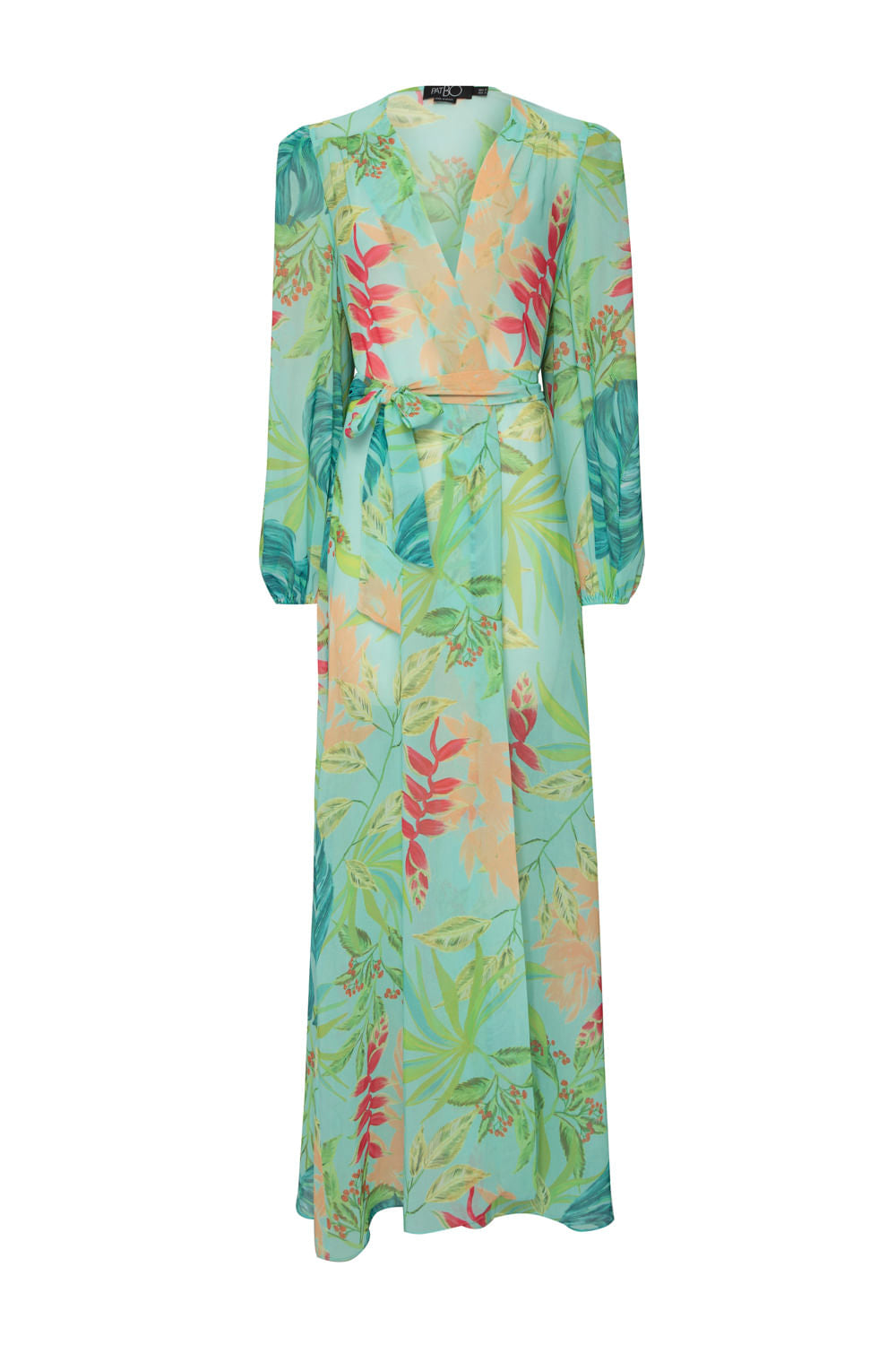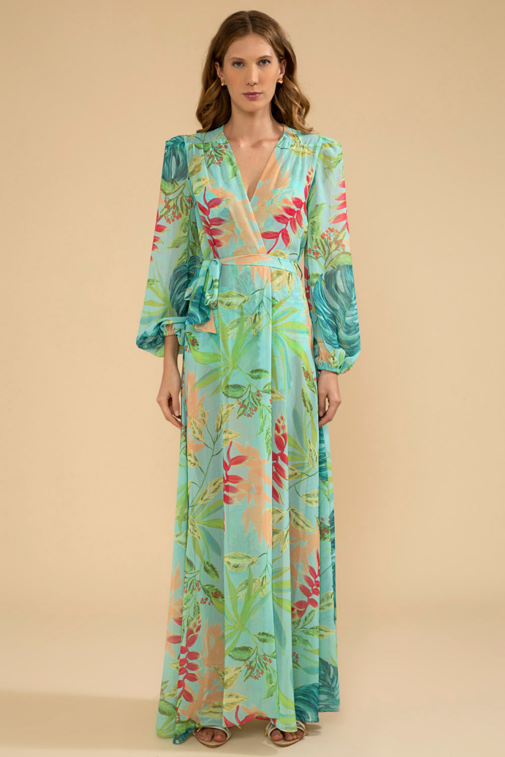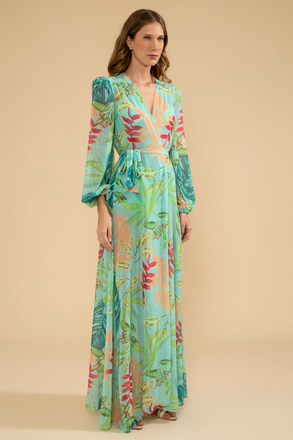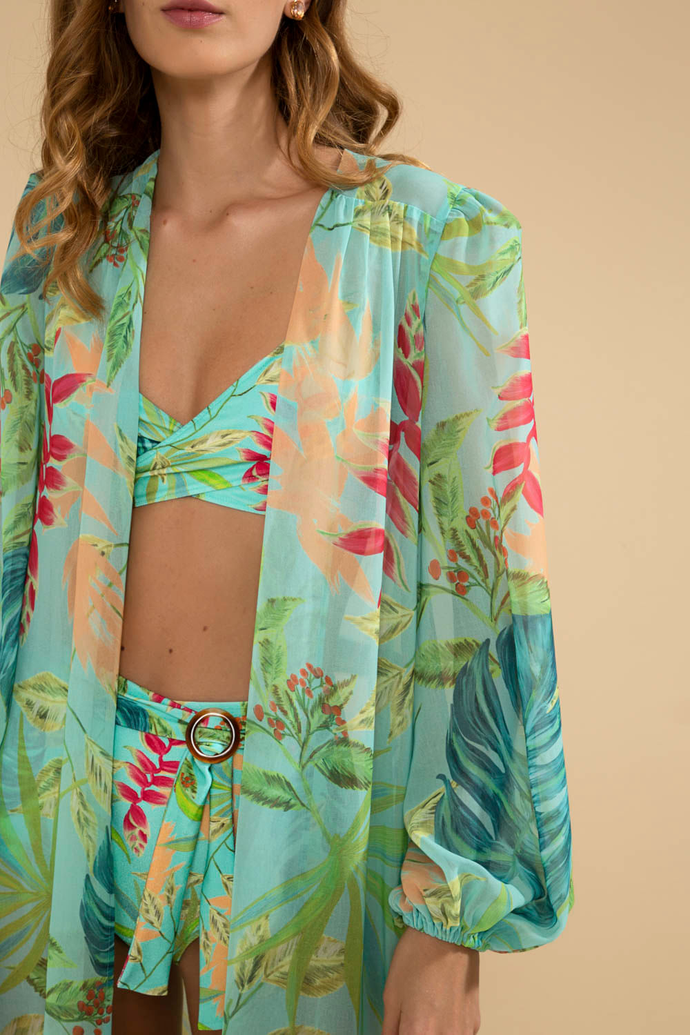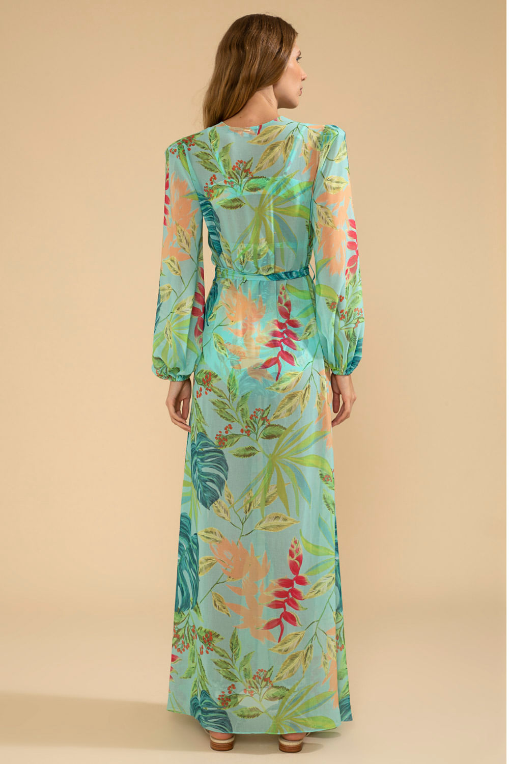 Saída de praia longa estampada e transpassada com mangas longas, ombreiras, elástico embutido nos punhos, dois passantes e faixa dupla para amarração na cintura.