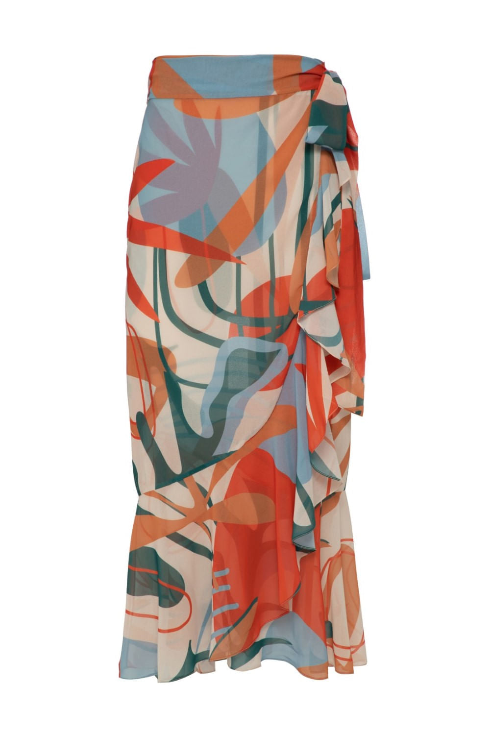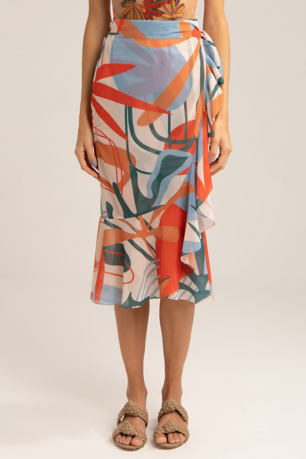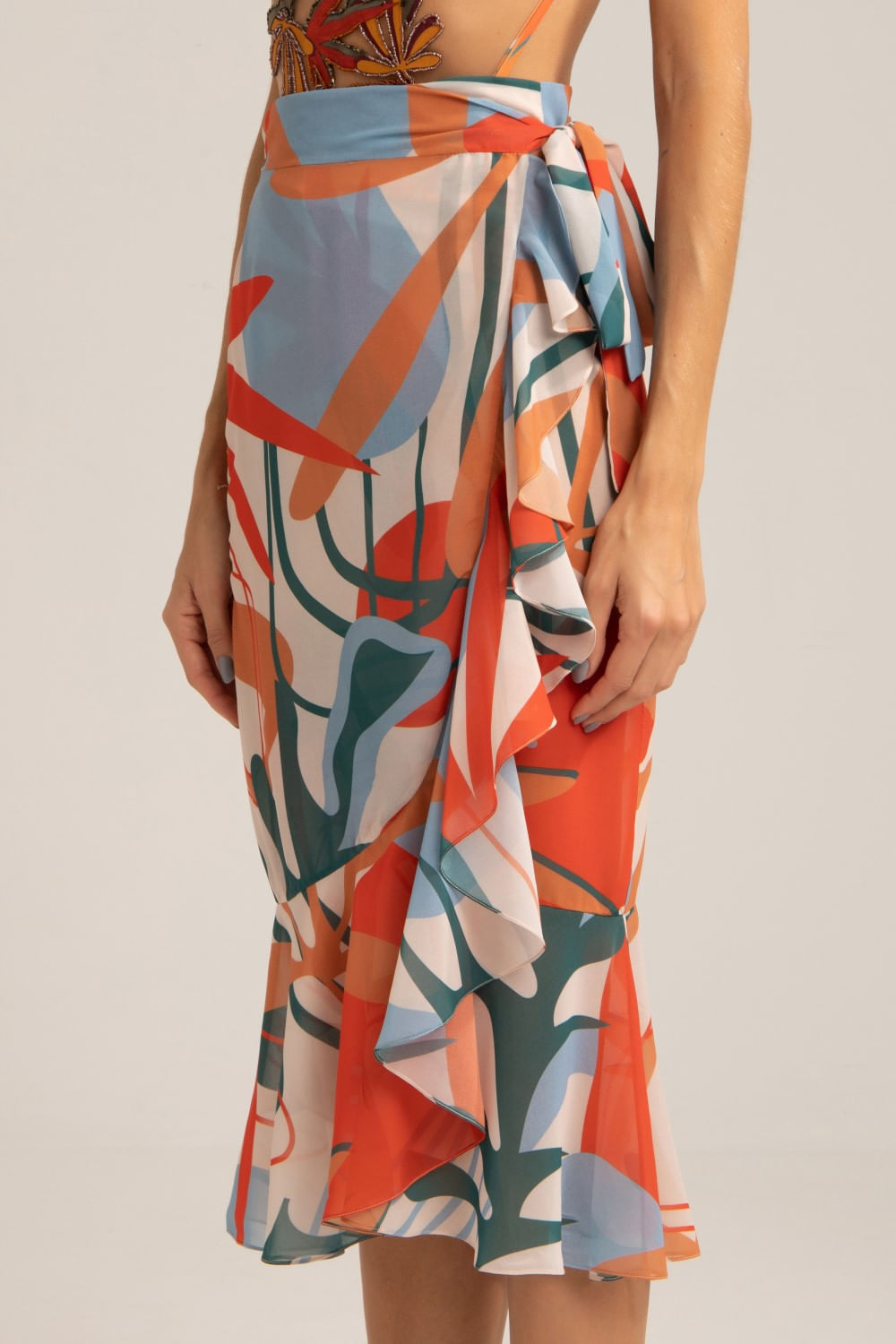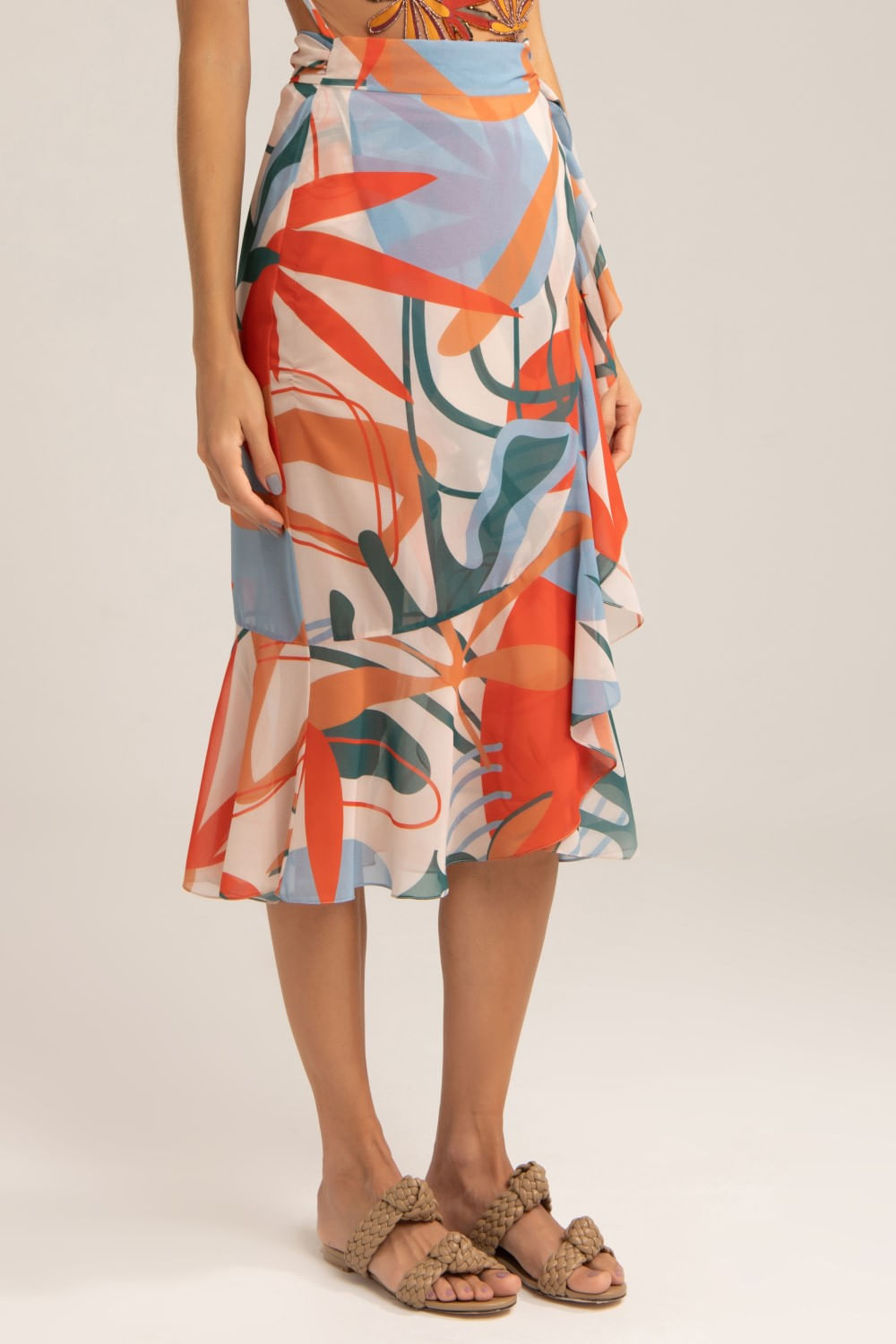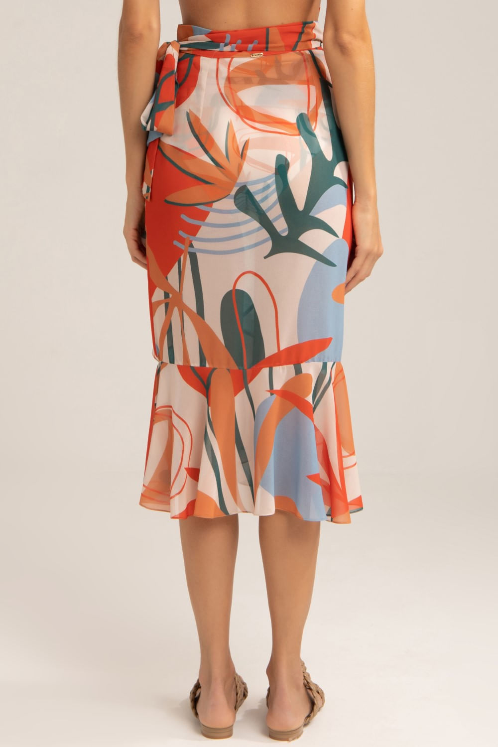 Saída de praia mídi transpassada com faixa dupla para amarração na cintura e uma camada de babado em toda a barra.