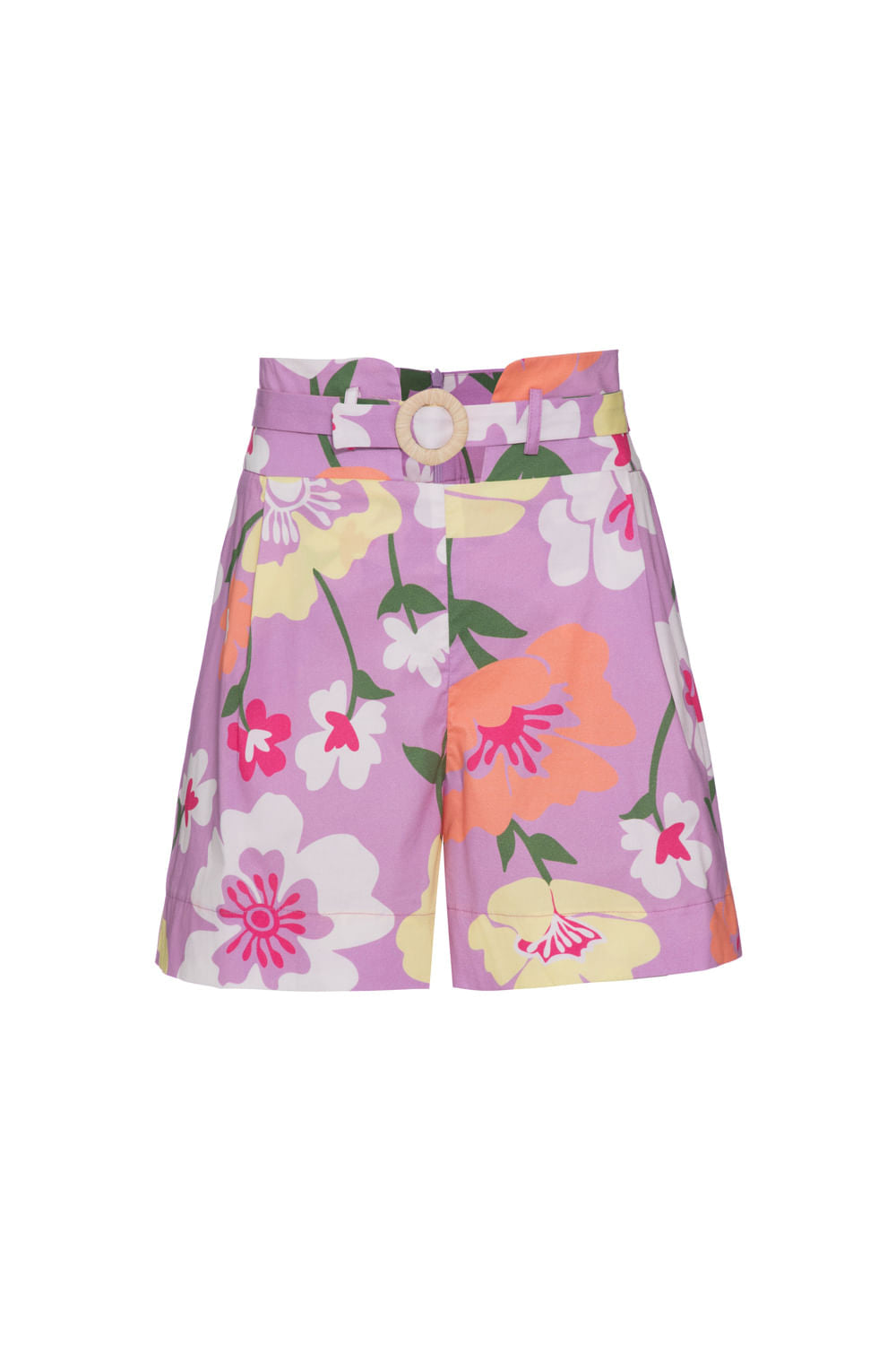 Short estampado com cós alto, argola encapada com palha no centro frente, dois bolsos laterais e zíper invisível na parte posterior da peça.