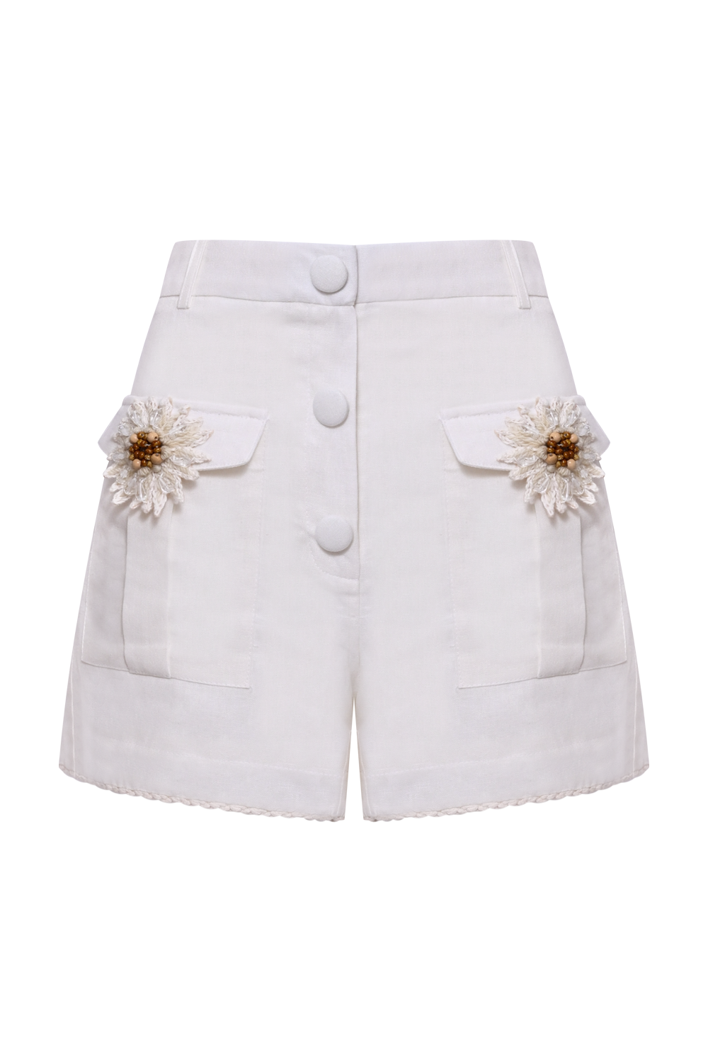 O shorts linho tropic traz todo o frescor e feminilidade para o verão. O tecido é respirável e fresco casa perfeitamente com o caiimento amplo, com dois bolsos cargo na frente, com aplicações de bordado de linha que dão o toque rústico para o look resort. Para complementar, na barra há um detalhamento em entremeio de algodão. Além disso, possui fechamento com gancho de alfaiataria e zíper e três botões decorativos.