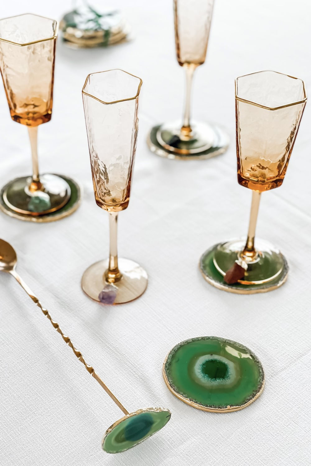 Taça para vinho branco hexagonal em vidro texturizado com borda pintada na cor dourado. Vidro resistente à altas temperaturas.