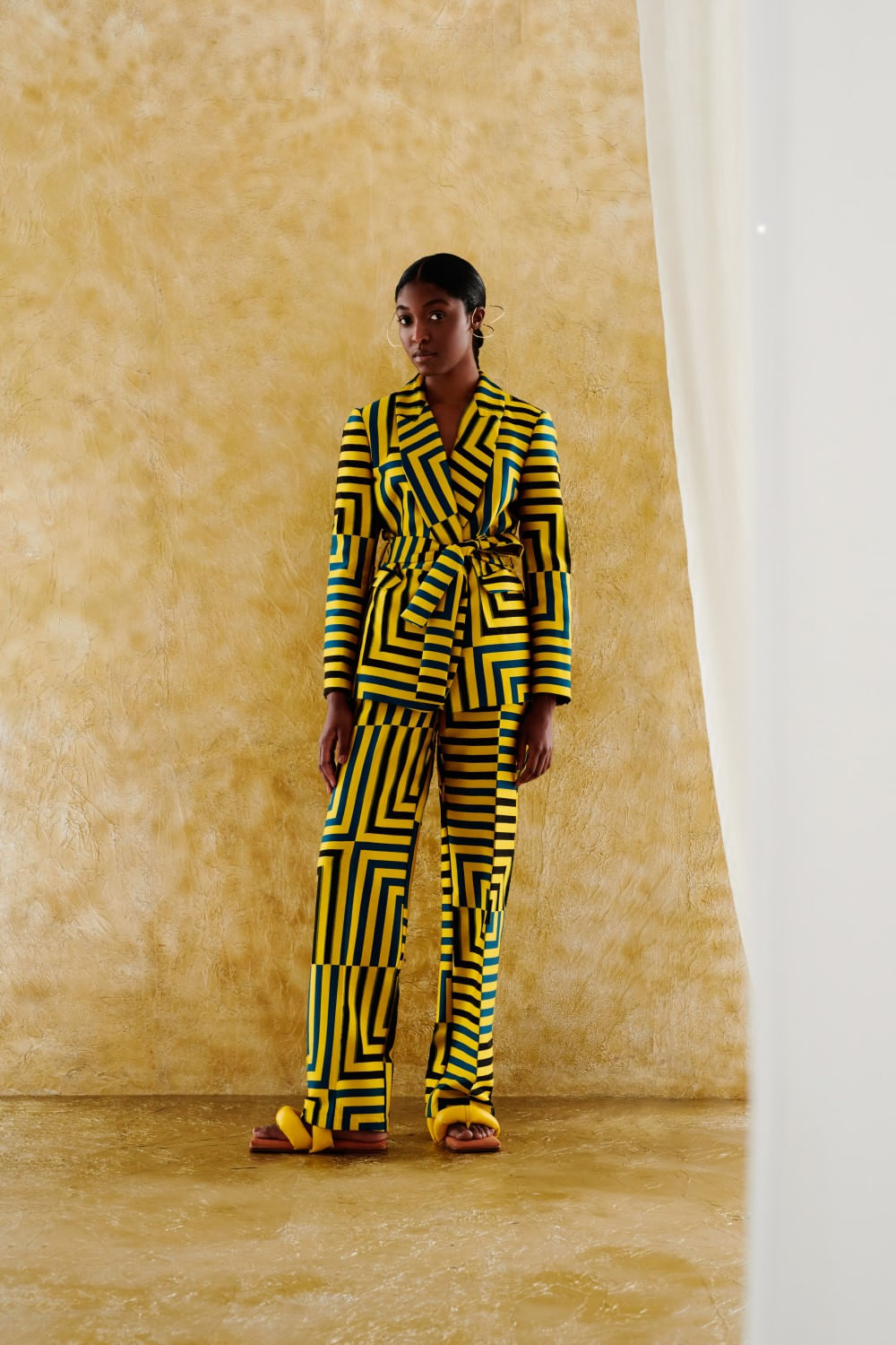 Terno de duas peças com estampa geográfica, blazer transpassado com gola dupla, mangas compridas e faixa para amarração na cintura. Calça estampada com cós duplo e vista com zíper fixo.