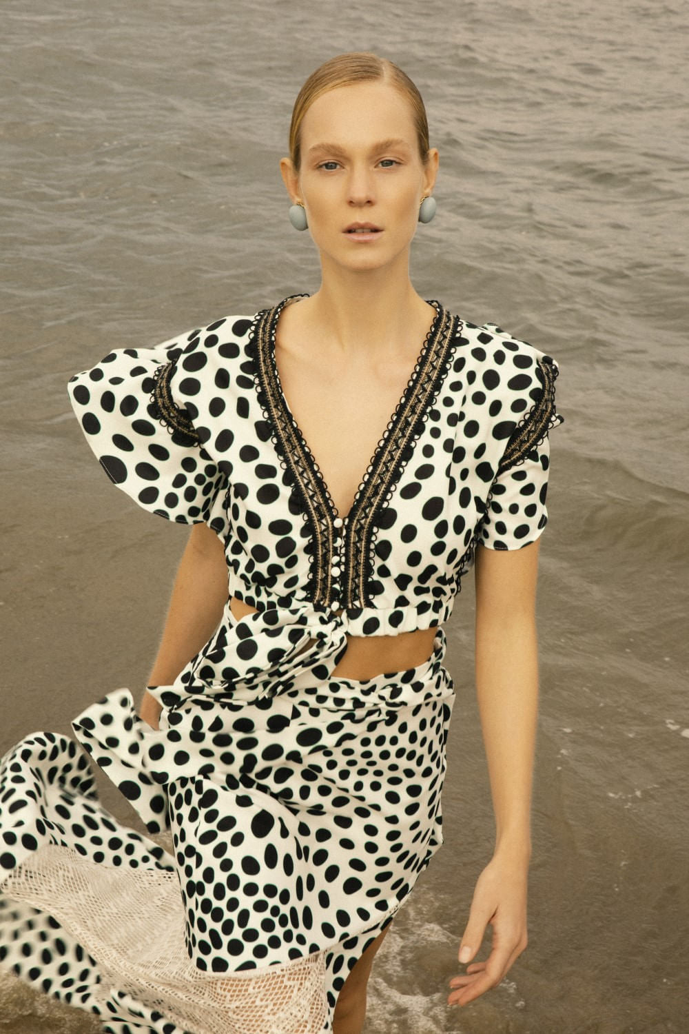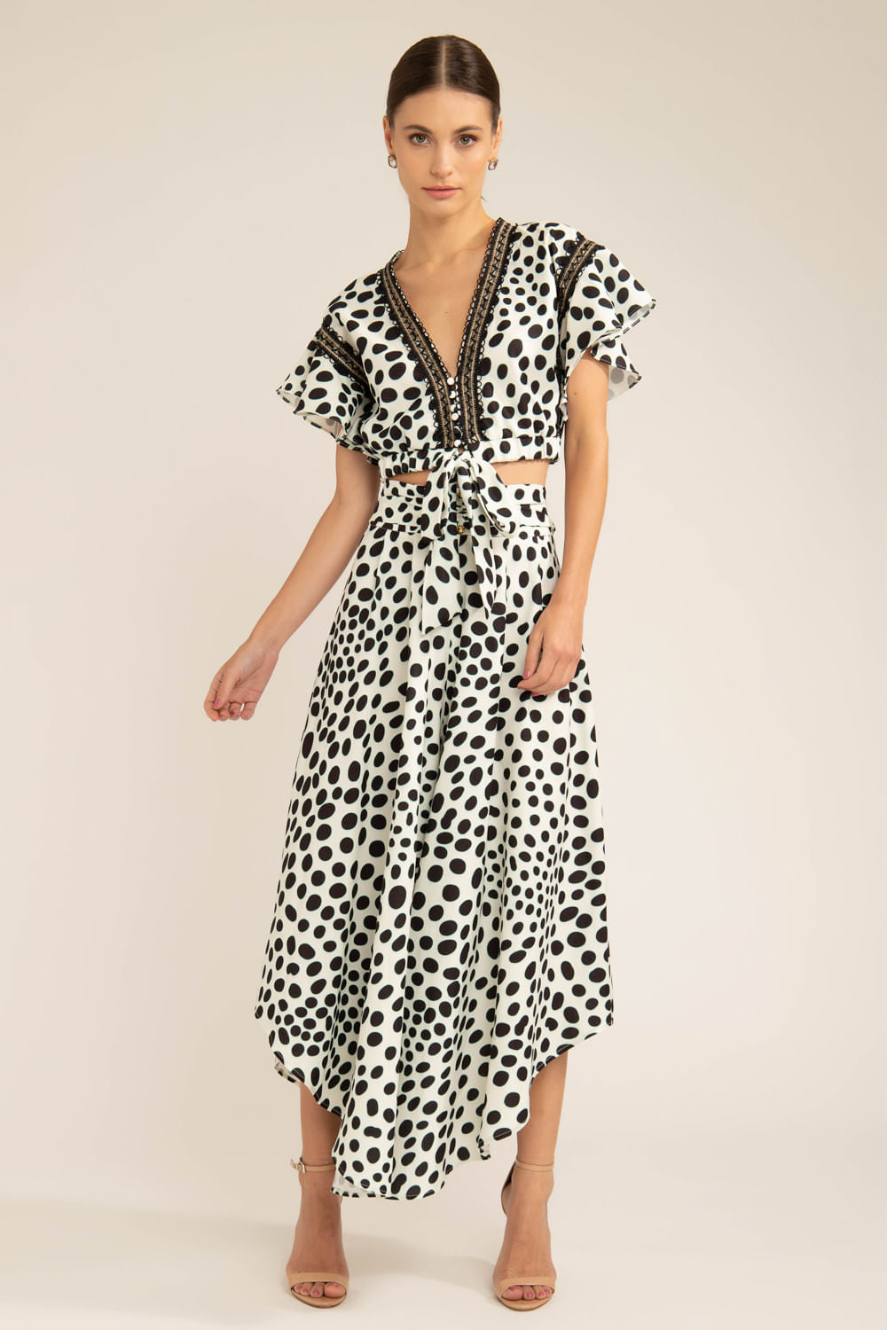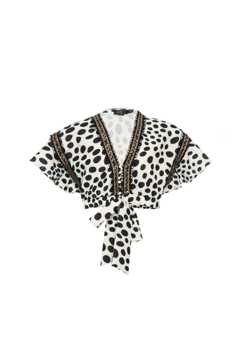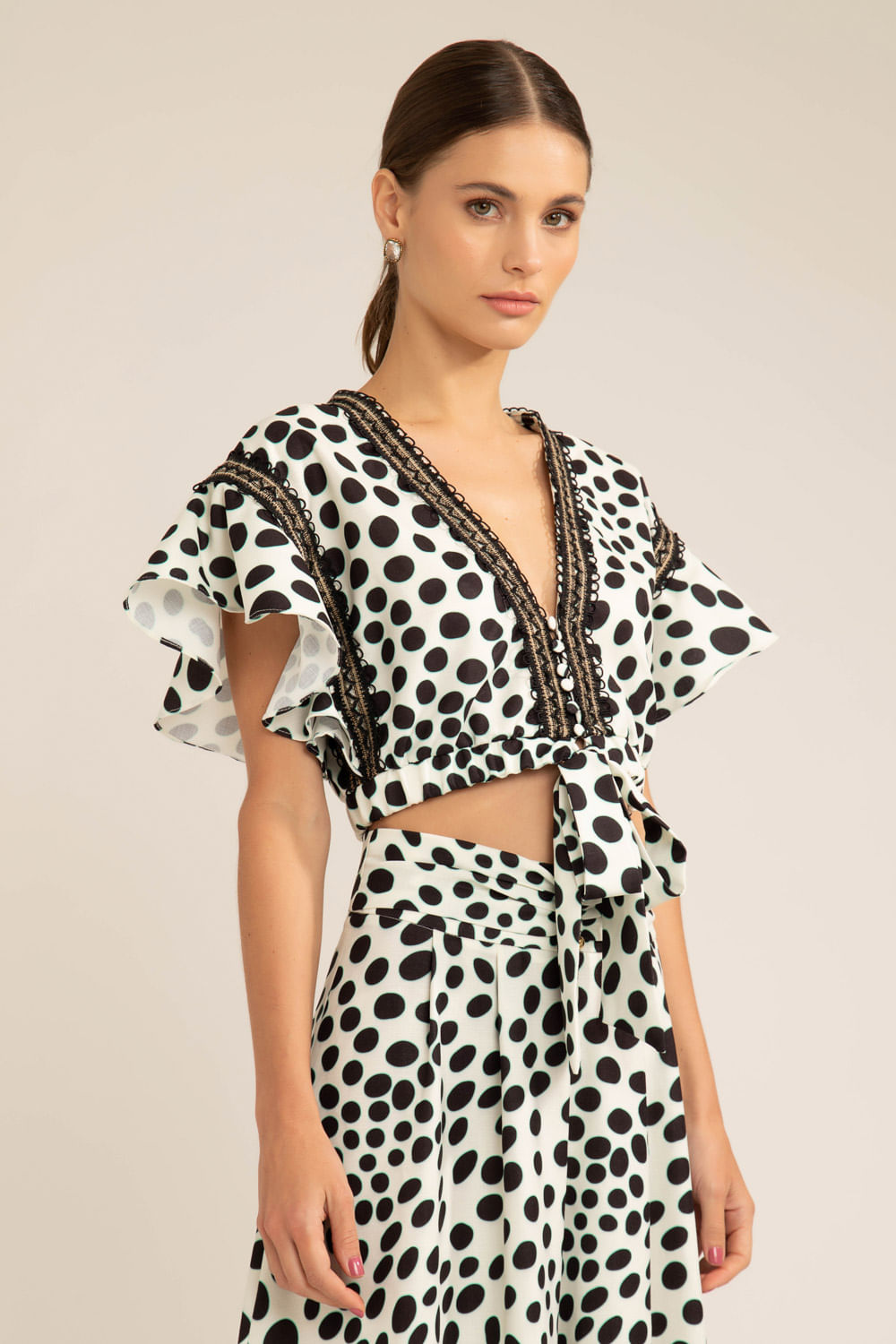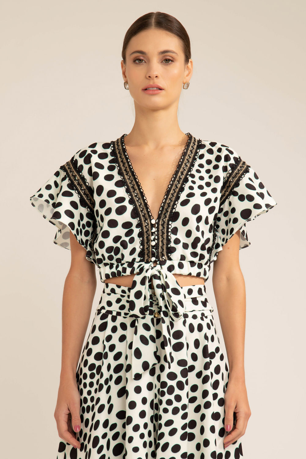 Top com decote V, seis botões encapados no centro frente, faixa dupla para amarração na