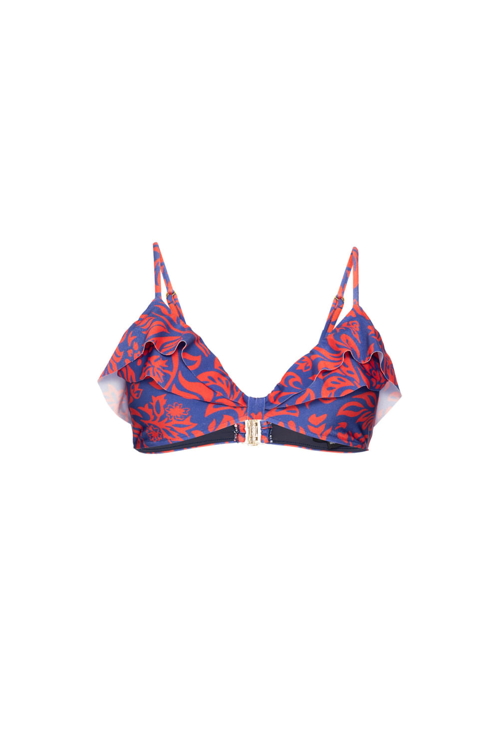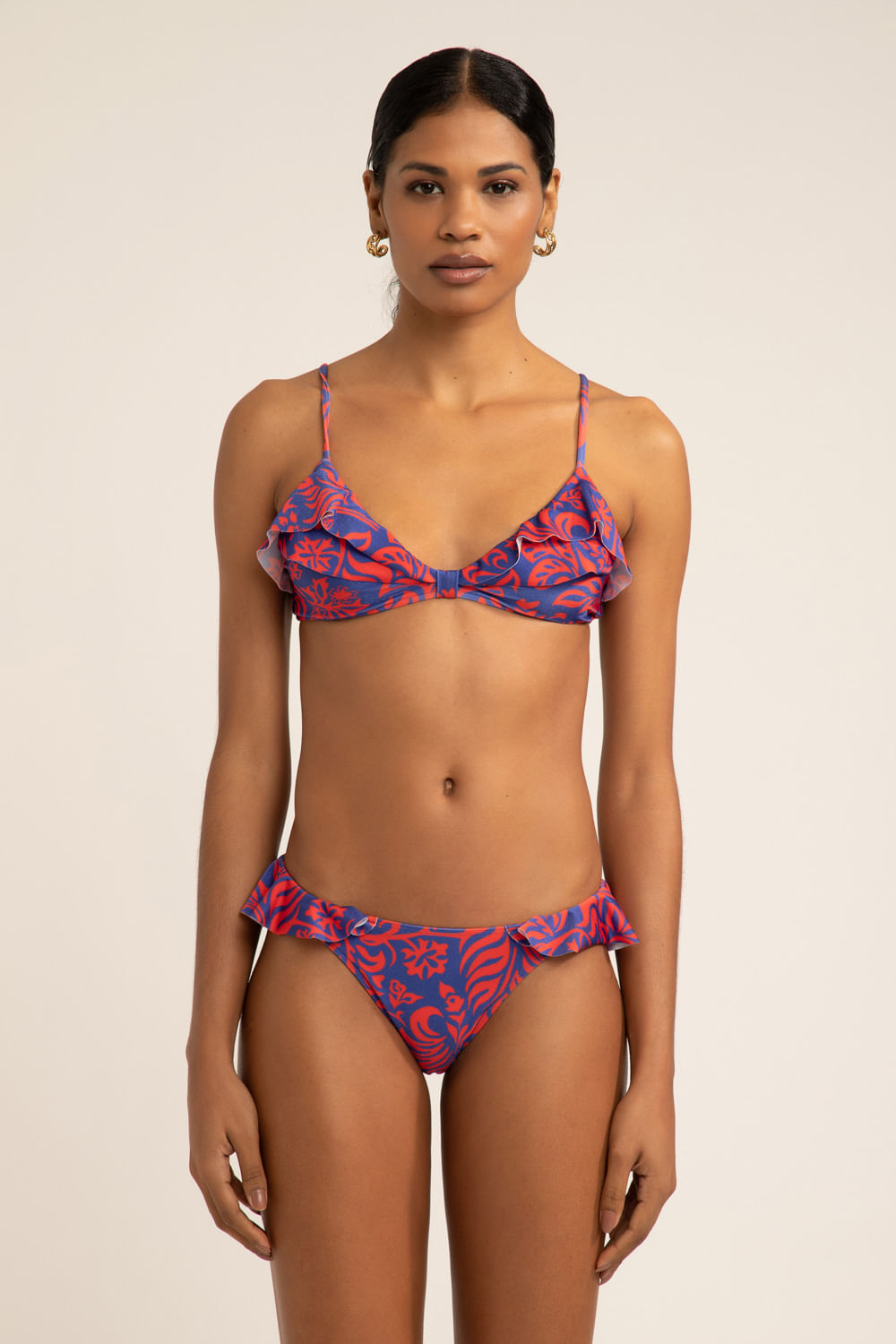 Top de biquíni estampado com tira dupla no centro frente, babadinho duplo no decote, alças finas e reguláveis, fecho de encaixe nas costas e forro interno.