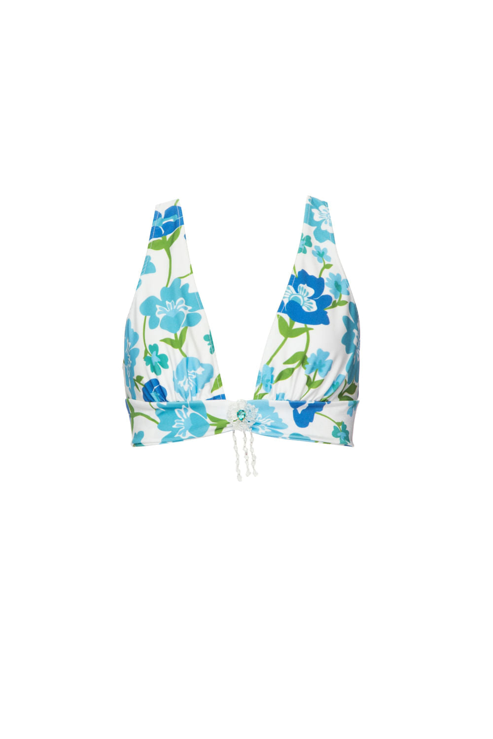 Top de biquíni estampado com bordado no centro frente, franzido abaixo do busto, alças largas, fecho de encaixe no centro costas e forro interno.