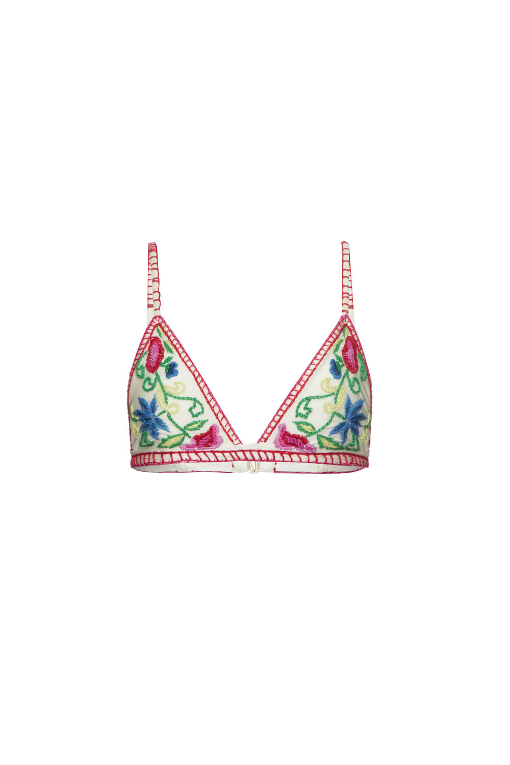 Top de biquini com com bordado de linha, aplicação de entremeio abaixo do busto, alças reguláveis, fecho de encaixe no centro costas e forro interno.