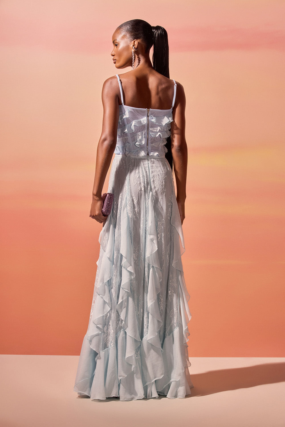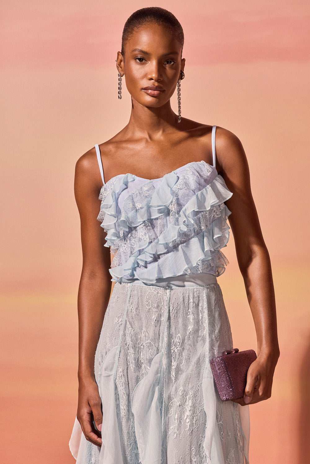 Delicadamente elaborado em chiffon etéreo, este top revela a união perfeita entre leveza e sofisticação. O corsê interno estruturado com aro proporciona sustentação e modela a silhueta de forma sutil, realçando a feminilidade com elegância. Os babados horizontais em renda e tule acrescentam textura refinada e movimento suave, criando um efeito visual de poesia em cada detalhe. O fechamento nas costas em zíper destacável traduz modernidade e acabamento impecável, elevando a peça a um símbolo de exclusividade e charme atemporal.