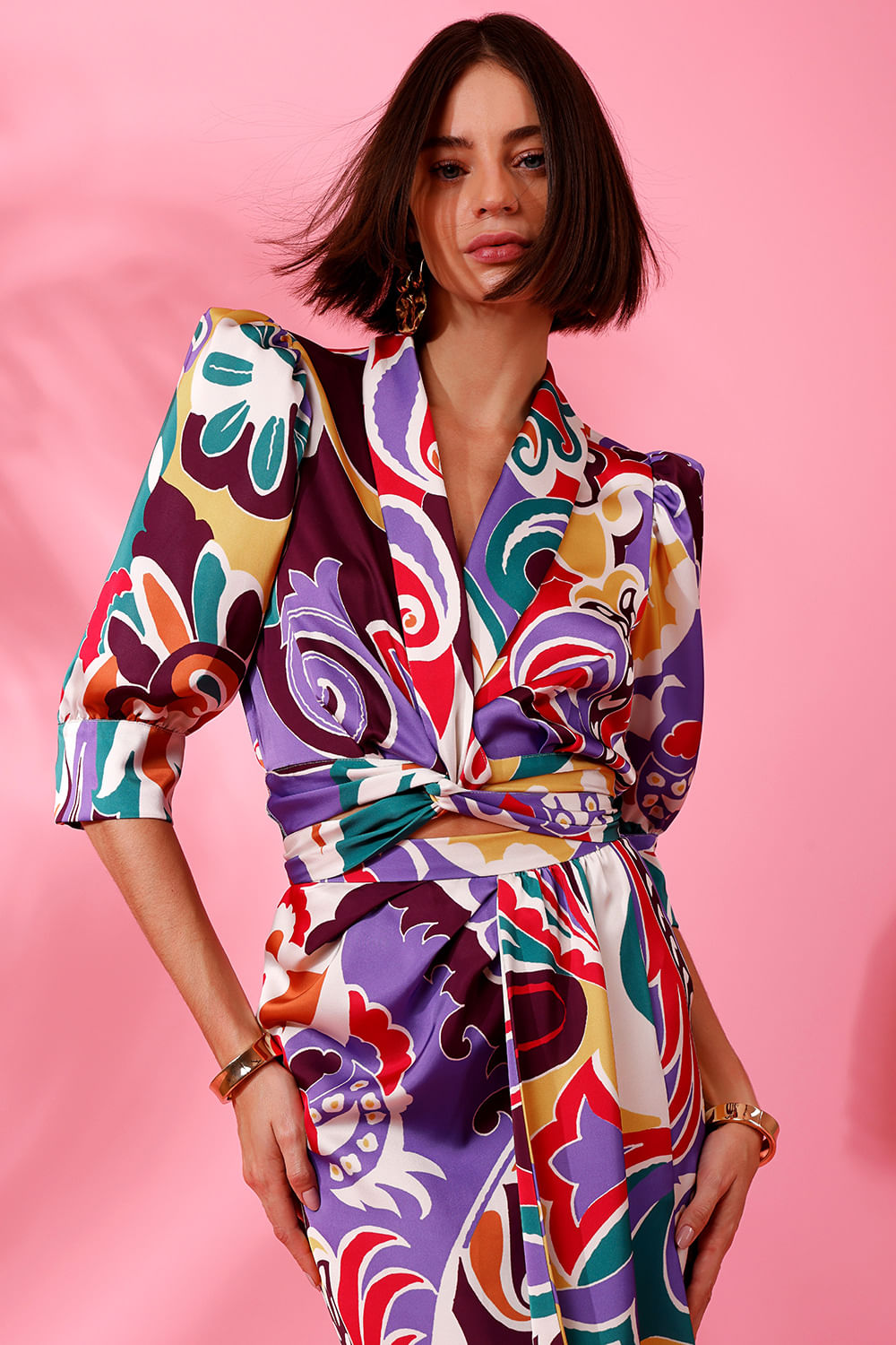 Top cropped estampado confeccionado em cetim, possui amarração frontal, gola dupla, ombreiras e três botões encapados nos punhos.