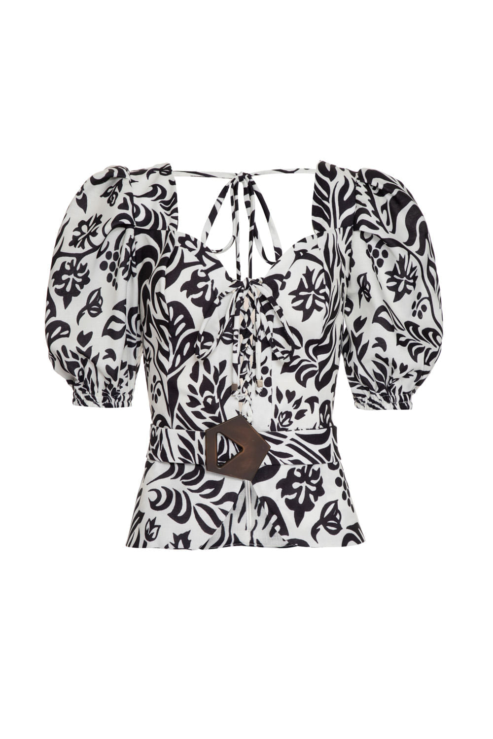 Blusa com mangas bufantes, trançado com cordões no centro frente, amarração nas costas, faixa dupla com fivela, elástico embutido nos punhos, zíper invisível nas costas e forro interno.