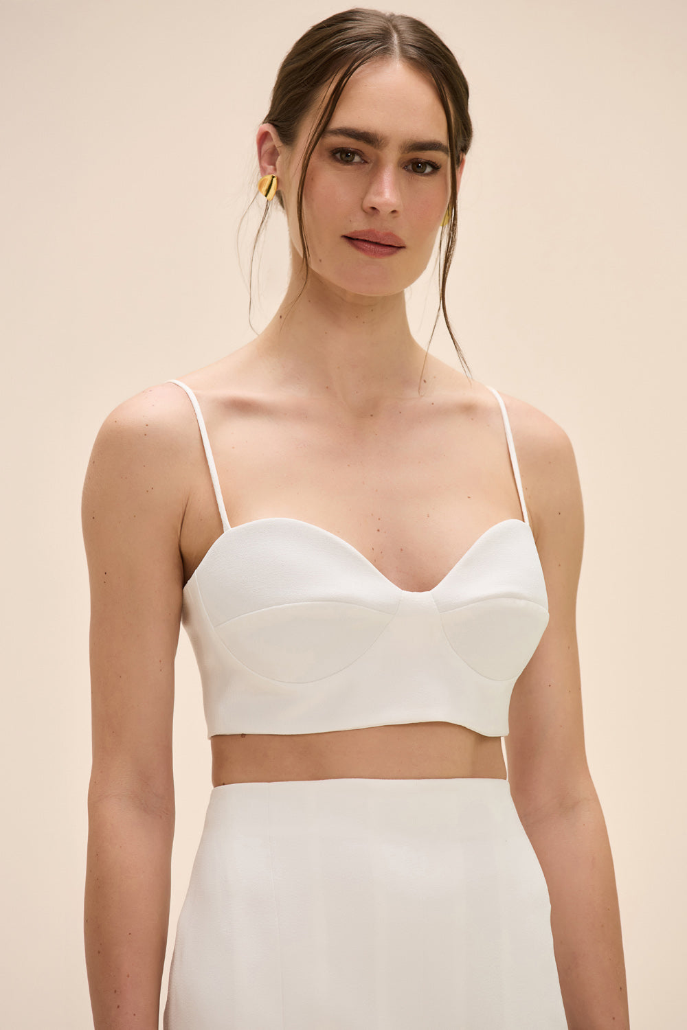 Top confeccionado em tecido crepe de caimento refinado, com design clean e elegante. As alças finas com reguladores garantem ajuste perfeito, enquanto o zíper destacável nas costas adiciona praticidade e um toque contemporâneo.