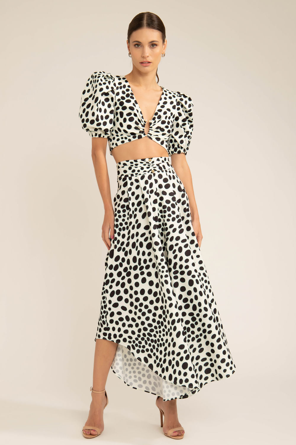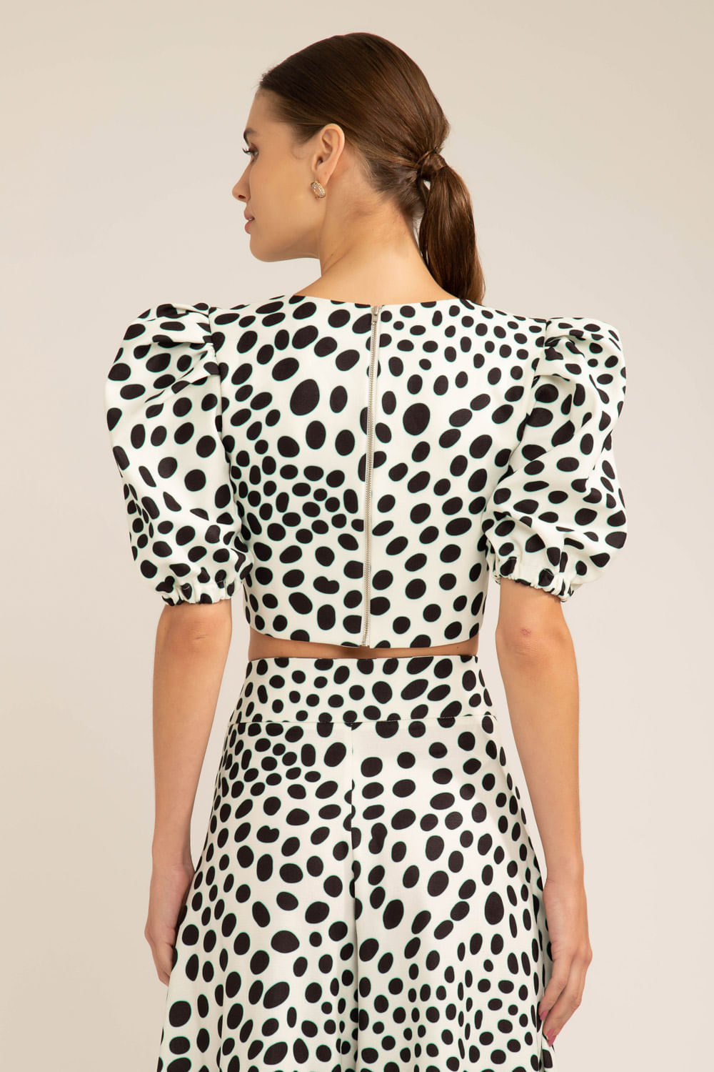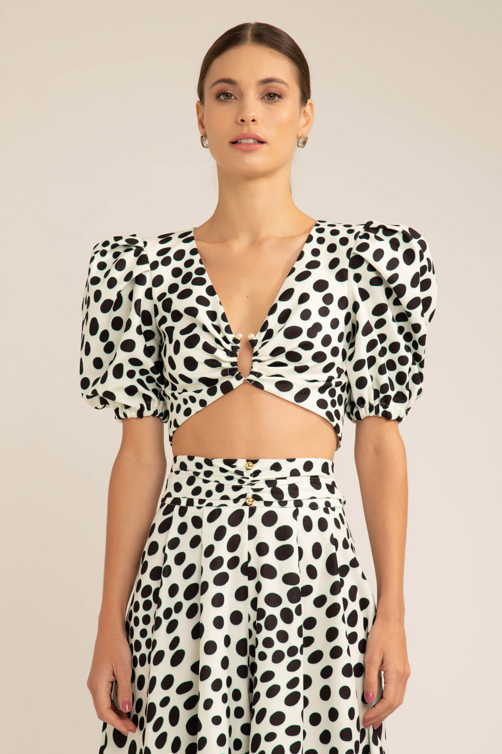 Top com ombreiras, mangas volumosas e franzido no centro do busto, nos ombros e nos punhos. Aviamento de metal no centro frente, zíper de metal destacável nas costas e forro interno.