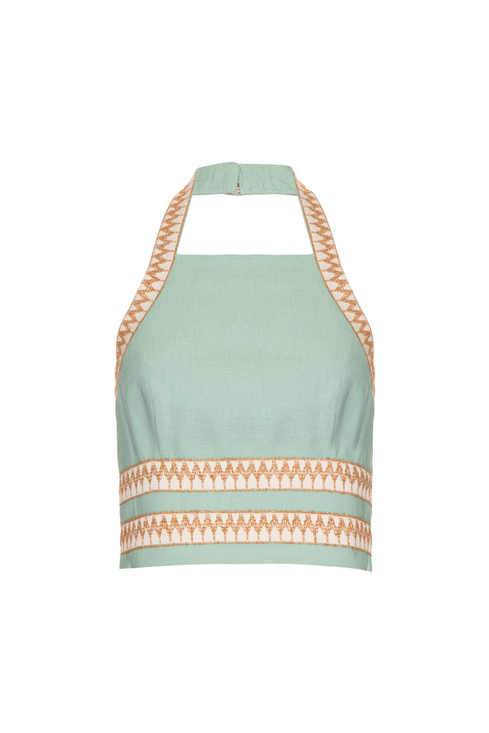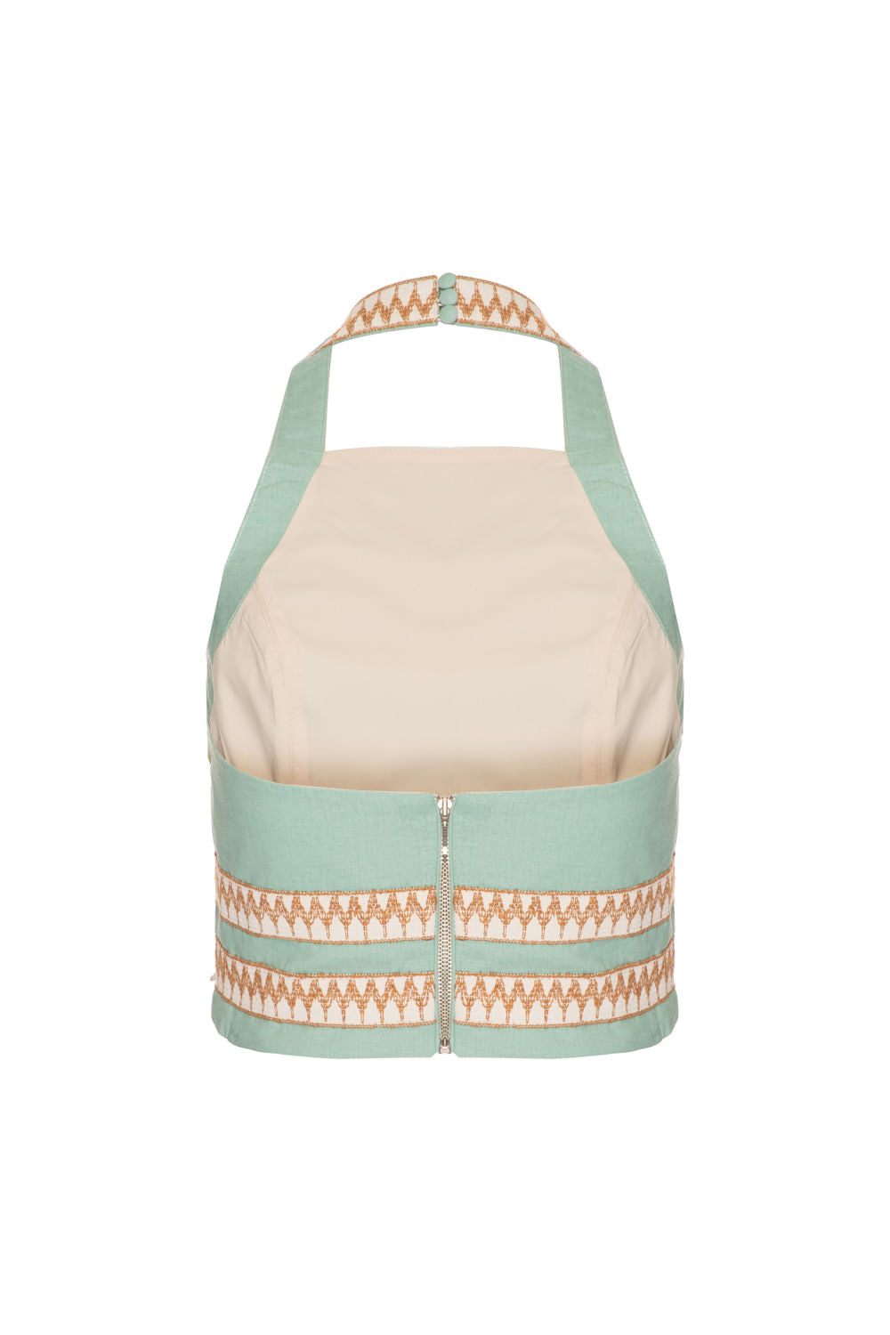 Top frente única com aplicação de entremeio, zíper destacável no centro costas, dois fechos de encaixe na nuca e forro interno.