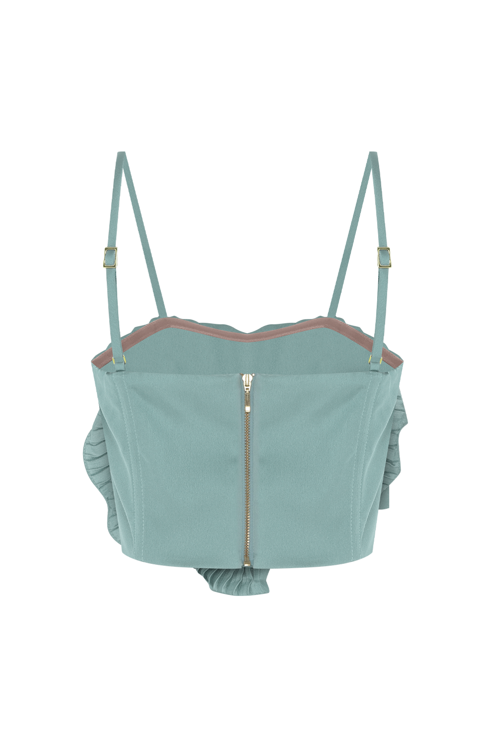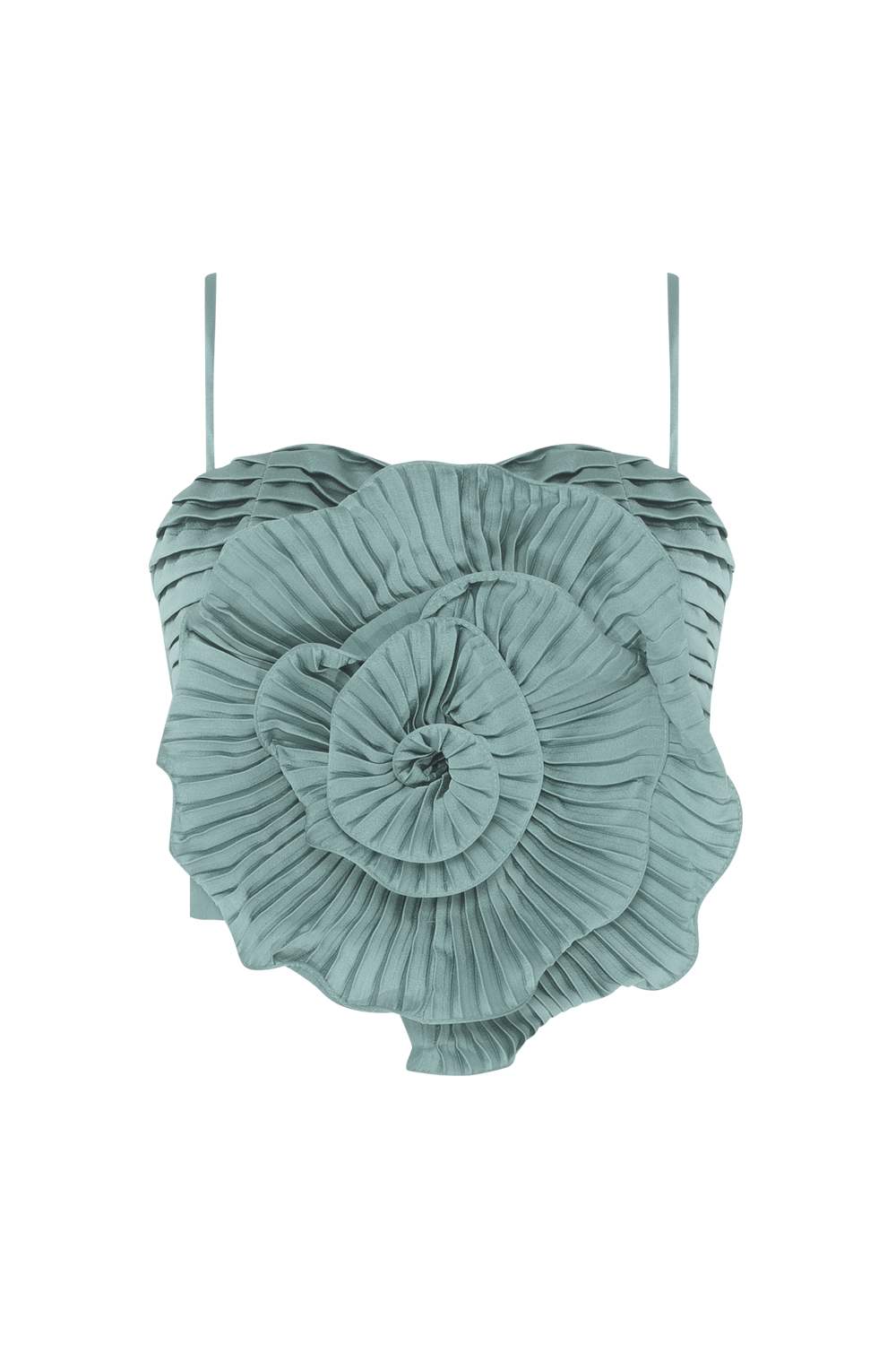 Top confeccionado em cetim com forro, possui flor plissada bordada na frente, pregas na região do busto, alças finas reguláveis e zíper de metal nas costas.
