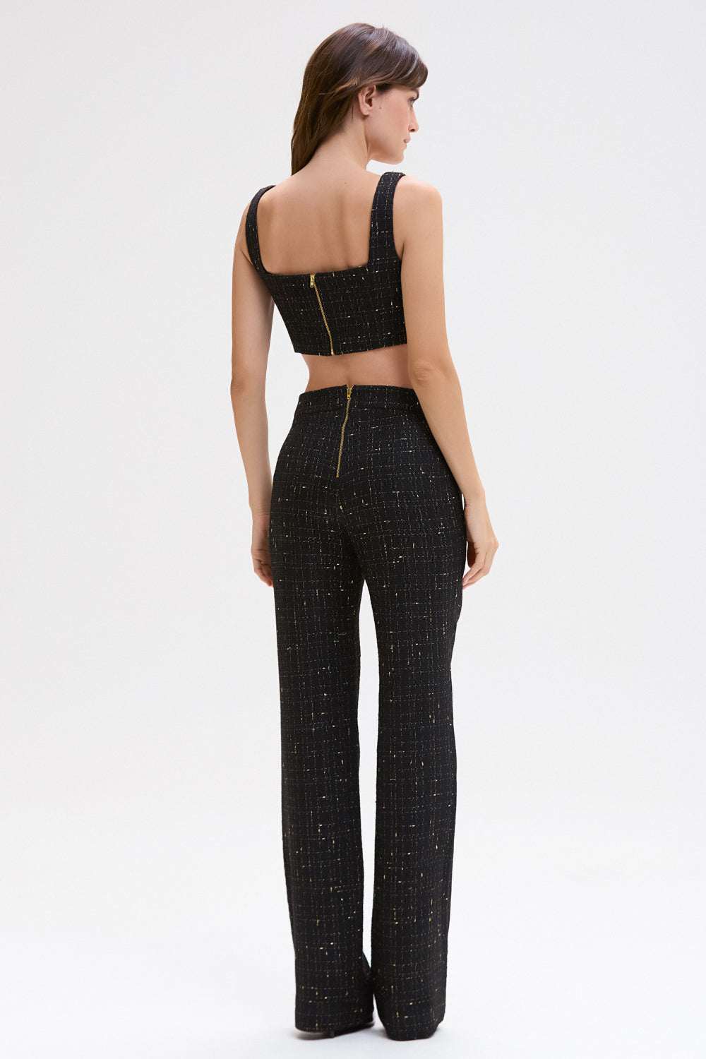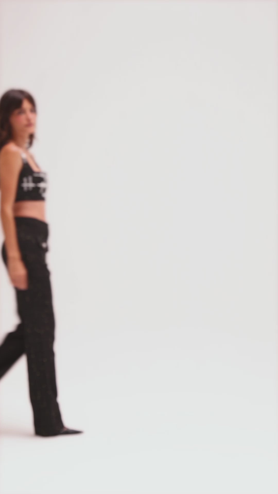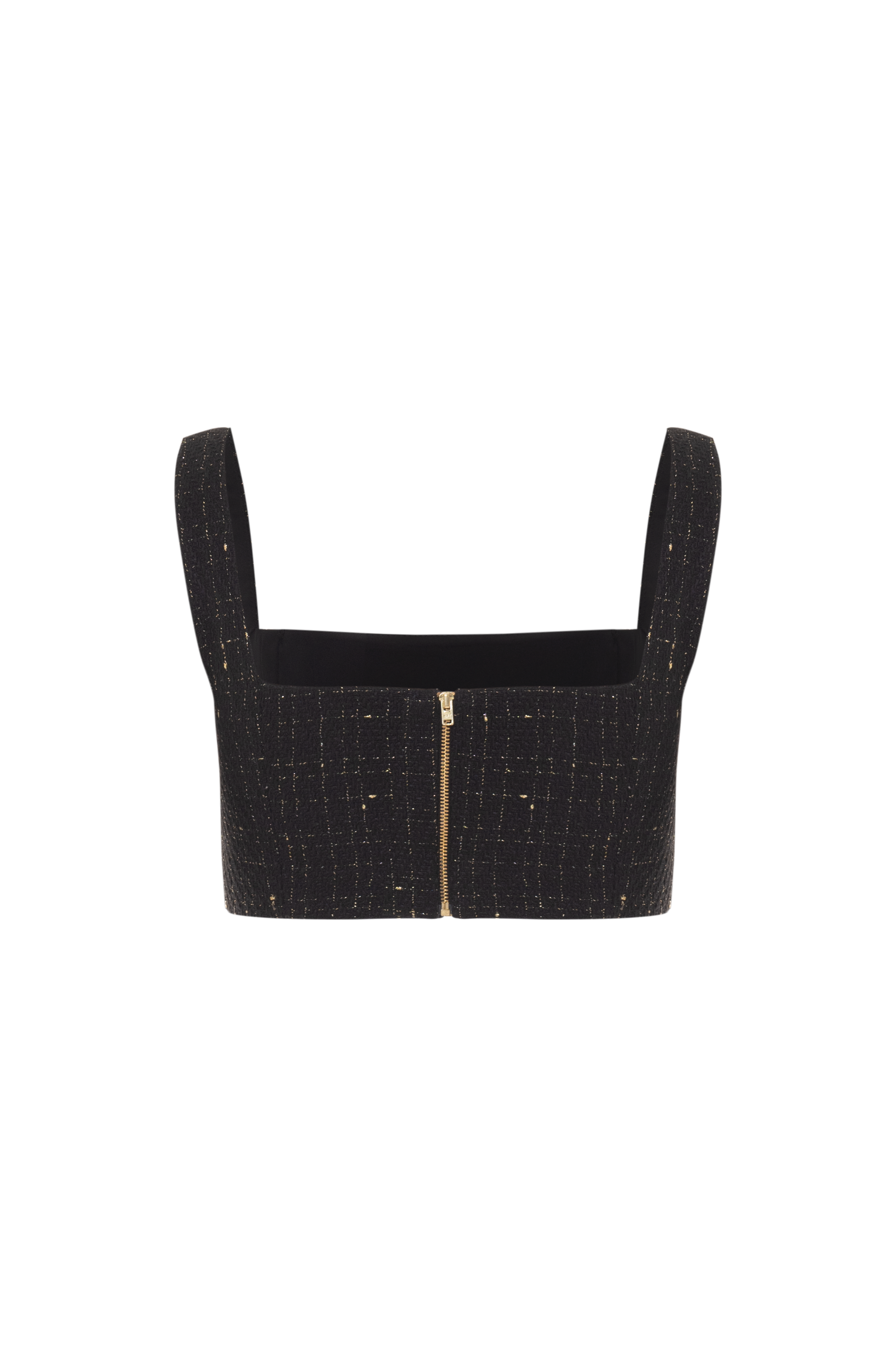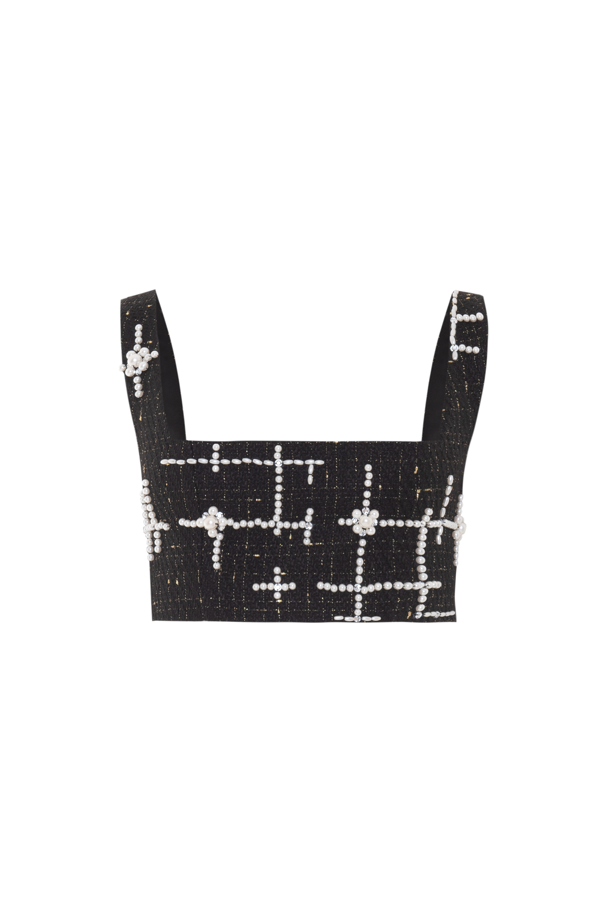 Top cropped confeccionado em tweed preto com fios dourados sutis, o modelo é inteiramente bordado à mão com pérolas e cristais em um padrão geométrico sofisticado, que combina luxo e modernidade. A modelagem estruturada valoriza a silhueta e o comprimento cropped torna a peça versátil para composições.
