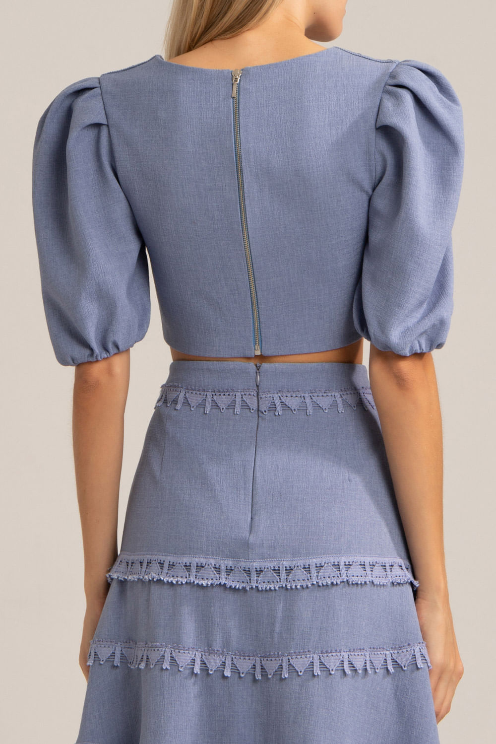 Top cropped com ferragem e franzido no centro do busto, entremeio vazado e sobreposto nos ombros, zíper destacável no centro costas e forro interno.