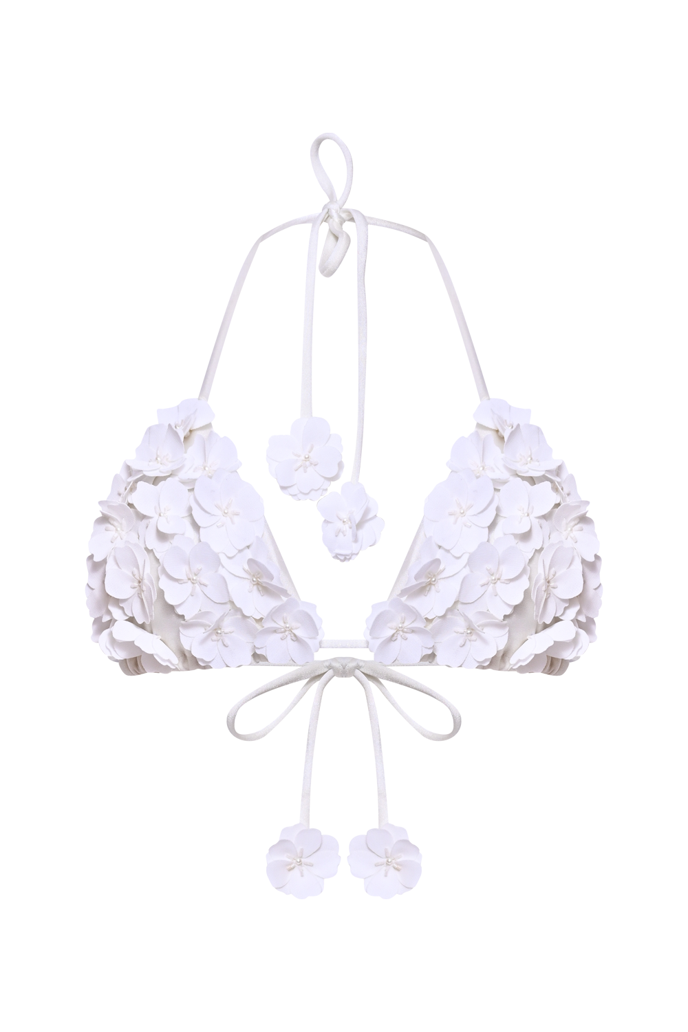 O top sunstone lycra reimagina o biquíni cortininha aos olhos da Patbo. Confeccionado em lycra, possui aplicação de flores 3D de musseline em todo o busto.