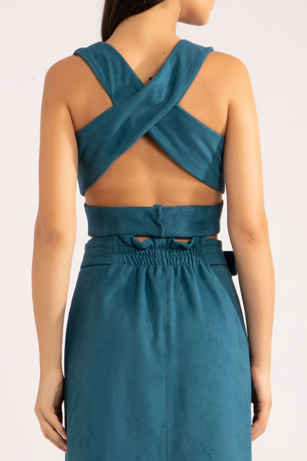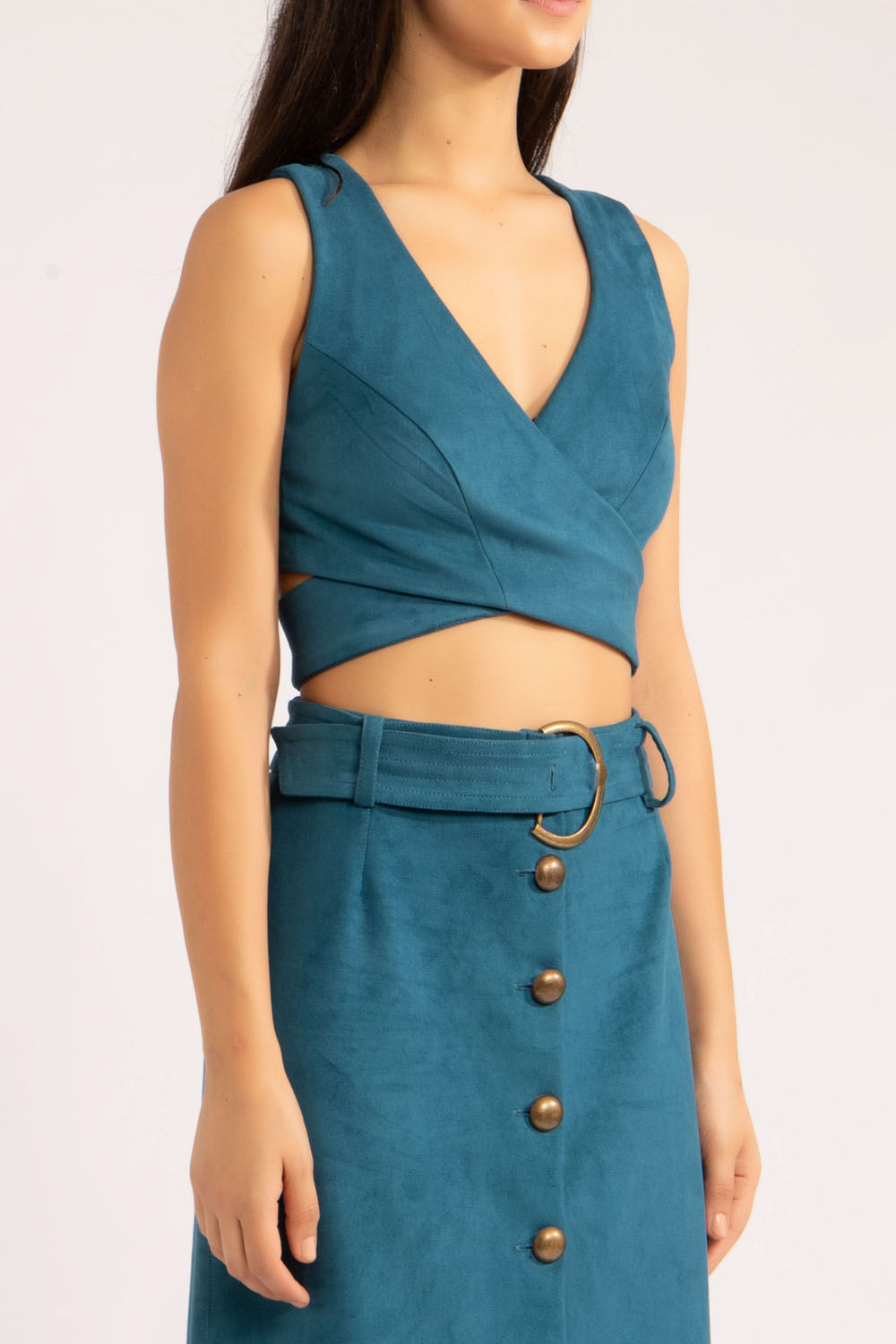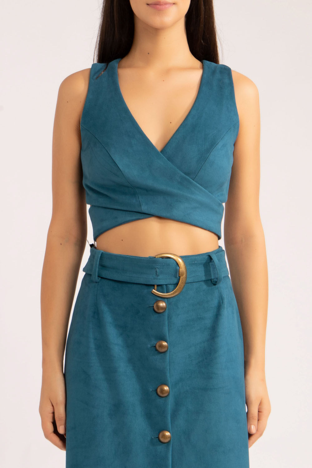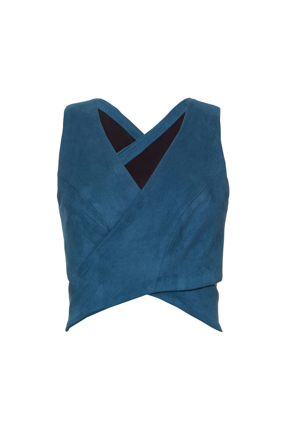 Top transpassado na frente e nas costas, 3 botões de pressão fazem o fechamento na tira reta no centro das costas e peça toda forrada.