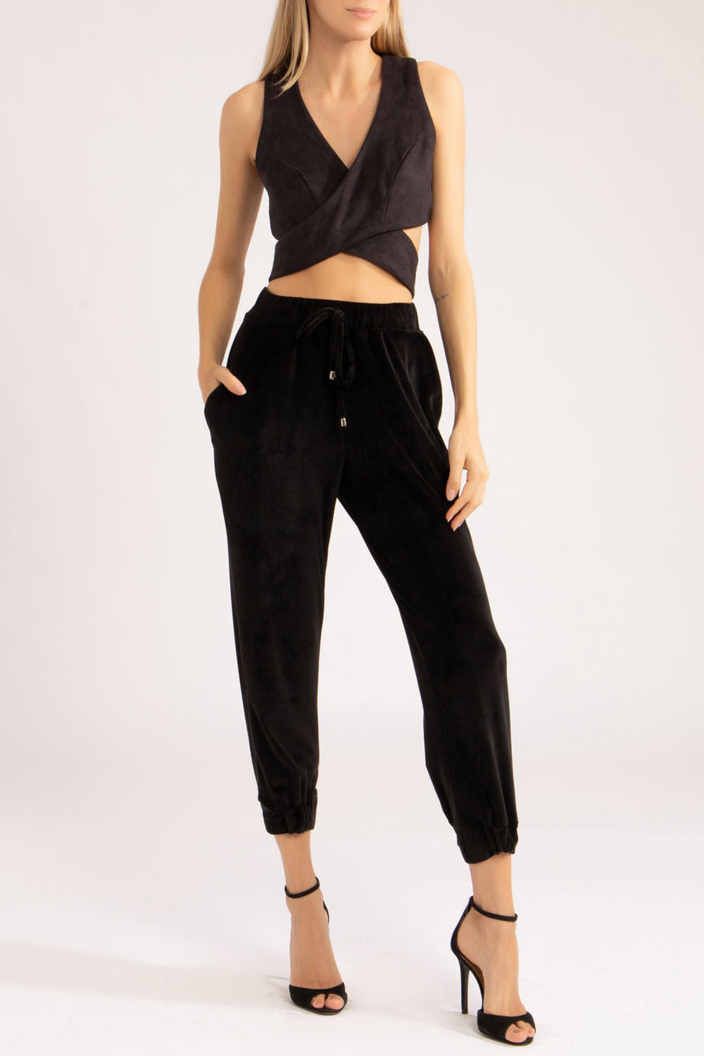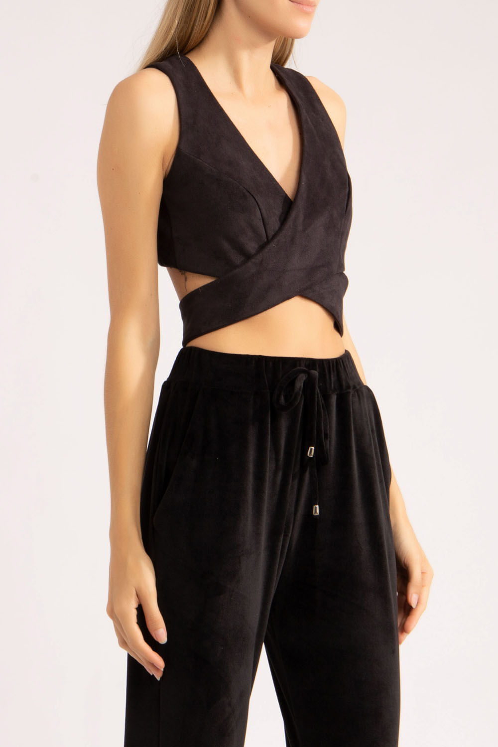 Top transpassado na frente e nas costas, 3 botões de pressão fazem o fechamento na tira reta no centro das costas e peça toda forrada.