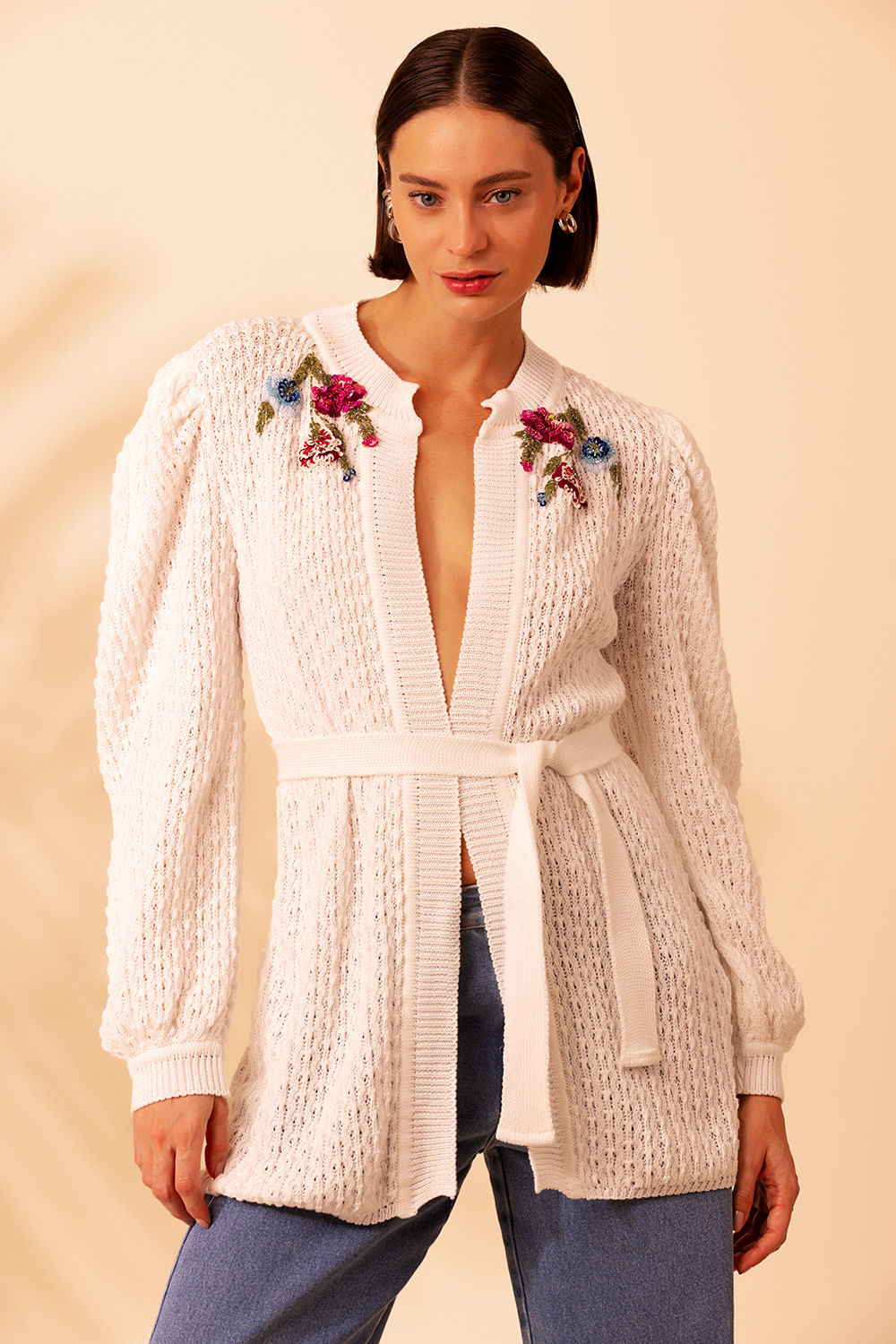 Casaco confeccionado em tricot, possui mangas longas, bordado aplicado, vista e punhos canelados e faixa na cintura.