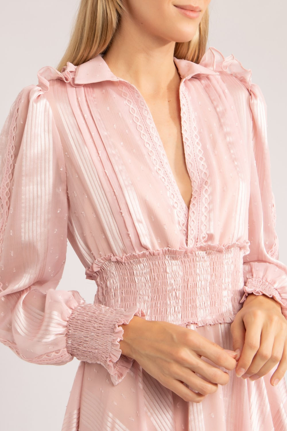 Vestido com gola dupla, babadinho nos ombros, faixa larga com lastéx na cintura, saia mais comprida nas laterais do que no centro, babado na barra das laterais da saia, entremeio sobreposto no decote, punho com lastéx e babadinho na abertura do punho. Forro na saia até a altura do joelho.