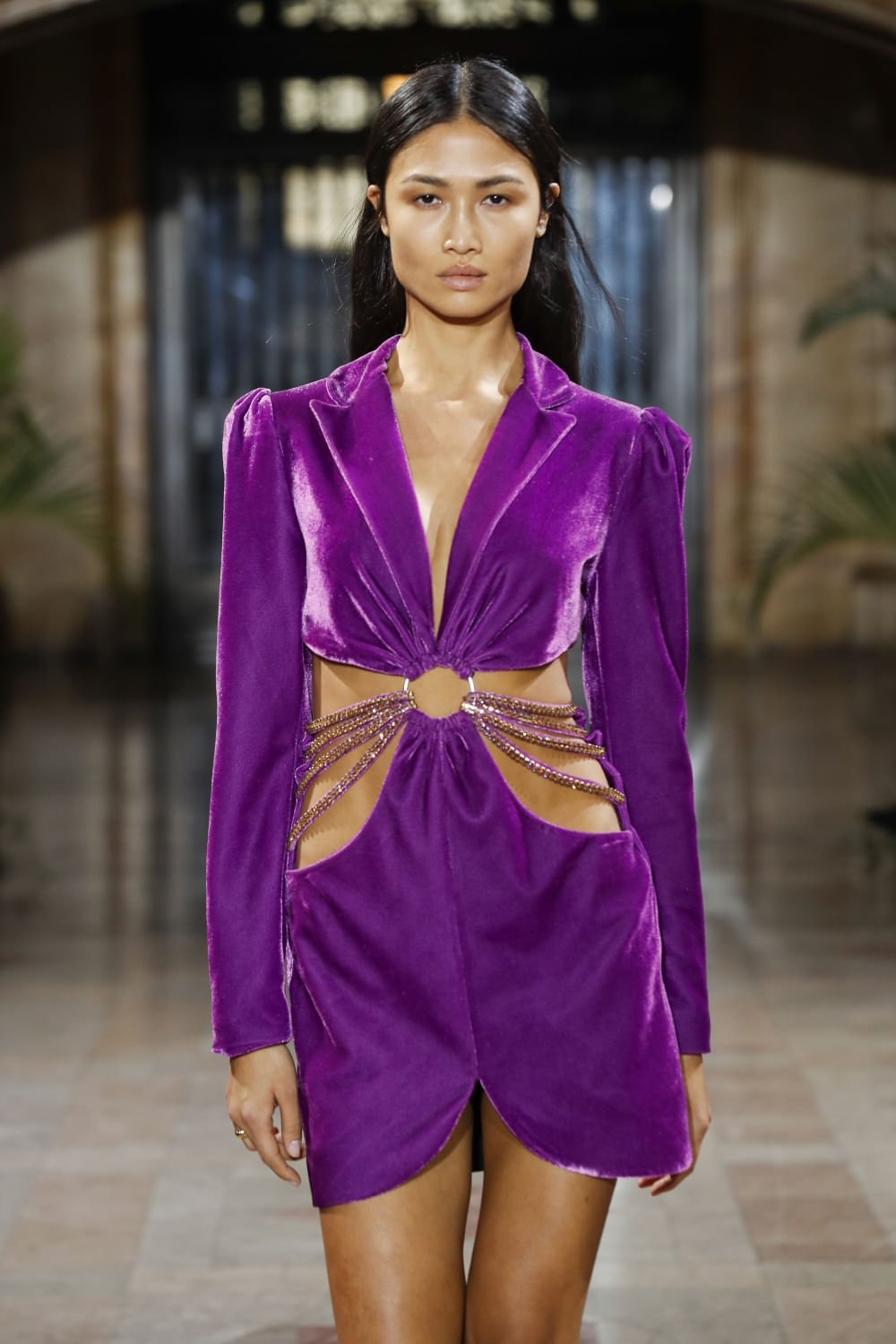 Vestido curto em veludo com argola no centro frente, gola dupla, mangas longas, ombreiras, oito tiras bordadas abaixo do busto, dois recortes vazados nas laterais, zíper invisível no centro costas e forro interno.