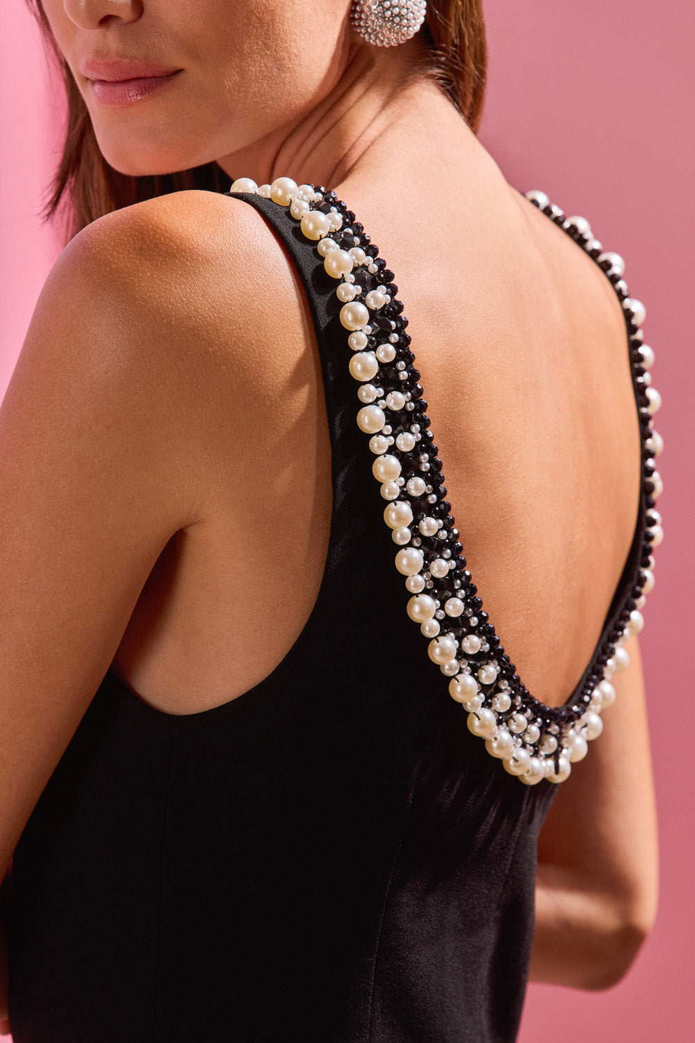 O vestido curto em crepe Dama com recorte central celebra a delicadeza e o charme feminino em cada detalhe. O laço aplicado e o bordado de pedrarias conferem brilho sutil, enquanto o shape evasê na barra adiciona movimento leve e elegância clássica. Uma peça que transforma o visual em sofisticação discreta e presença marcante.