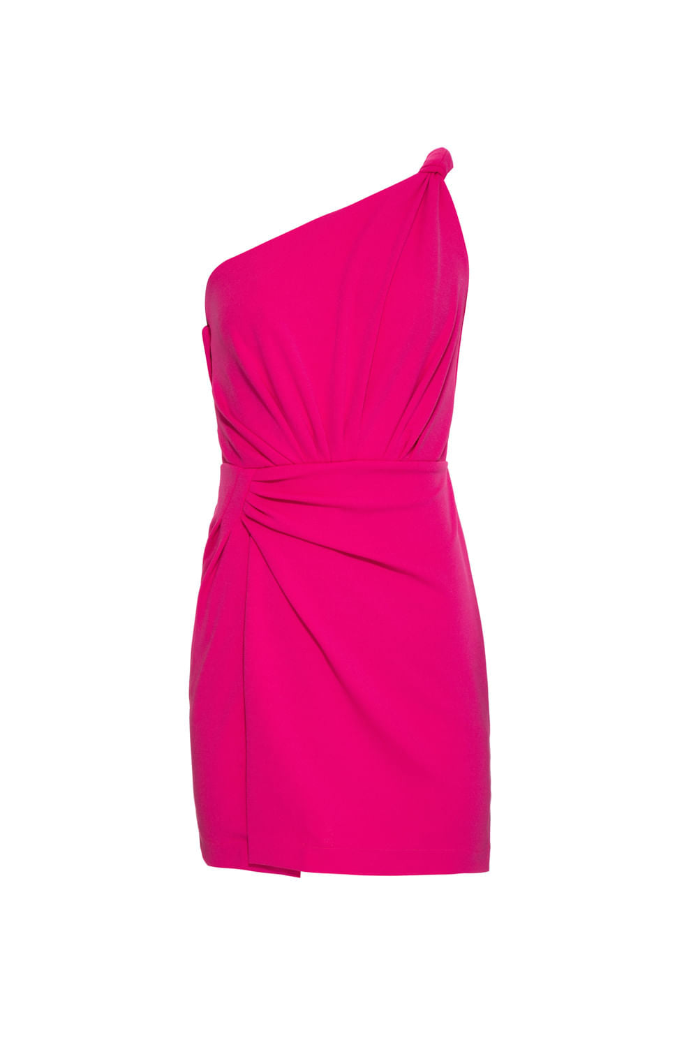 Vestido curto com ombro único, nó na alça, pregas no busto, laço removível, fenda frontal, zíper invisível no centro costas e forro parcial.
