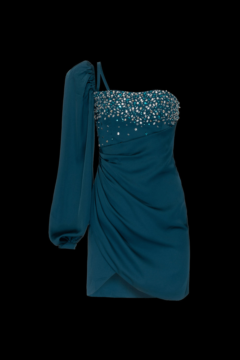 Vestido curto confeccionado em cetim, possui pregas, manga única, ombreira, alça fixa no ombro, bordado aplicado, hastes para sustentação, botão encapado no punho, saia transpassada, zíper invisível no centro costas e forro com o tecido principal.