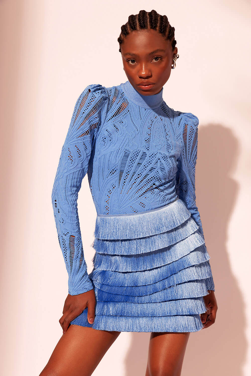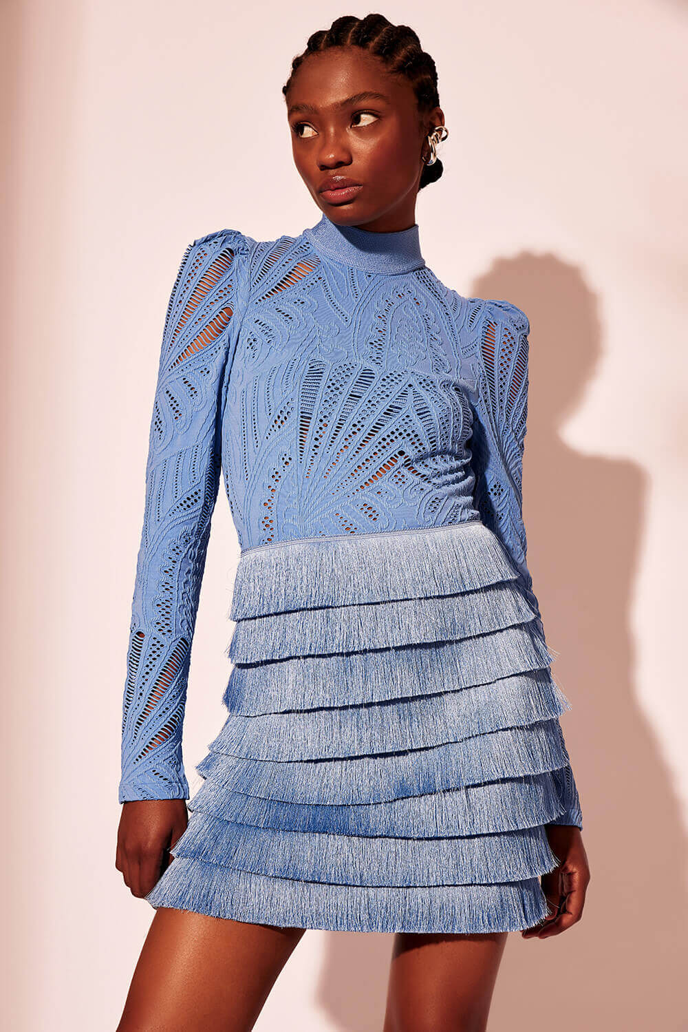 Vestido curto confeccionado em tela e malha com leve transparência, possui franjas aplicadas, mangas longas, gola alta, três botões encapados na nuca, abertura na parte posterior, zíper invisível no centro costas e forro parcial.